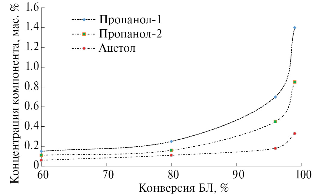 Рис. 3. Зависимость концентрации побочных продуктов от конверсии БЛ