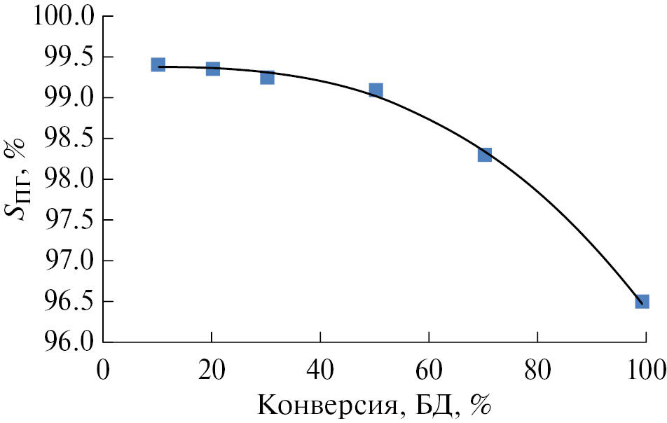 Рис. 4. Зависимость селективности образования 1,2-ПГ от конверсии БЛ