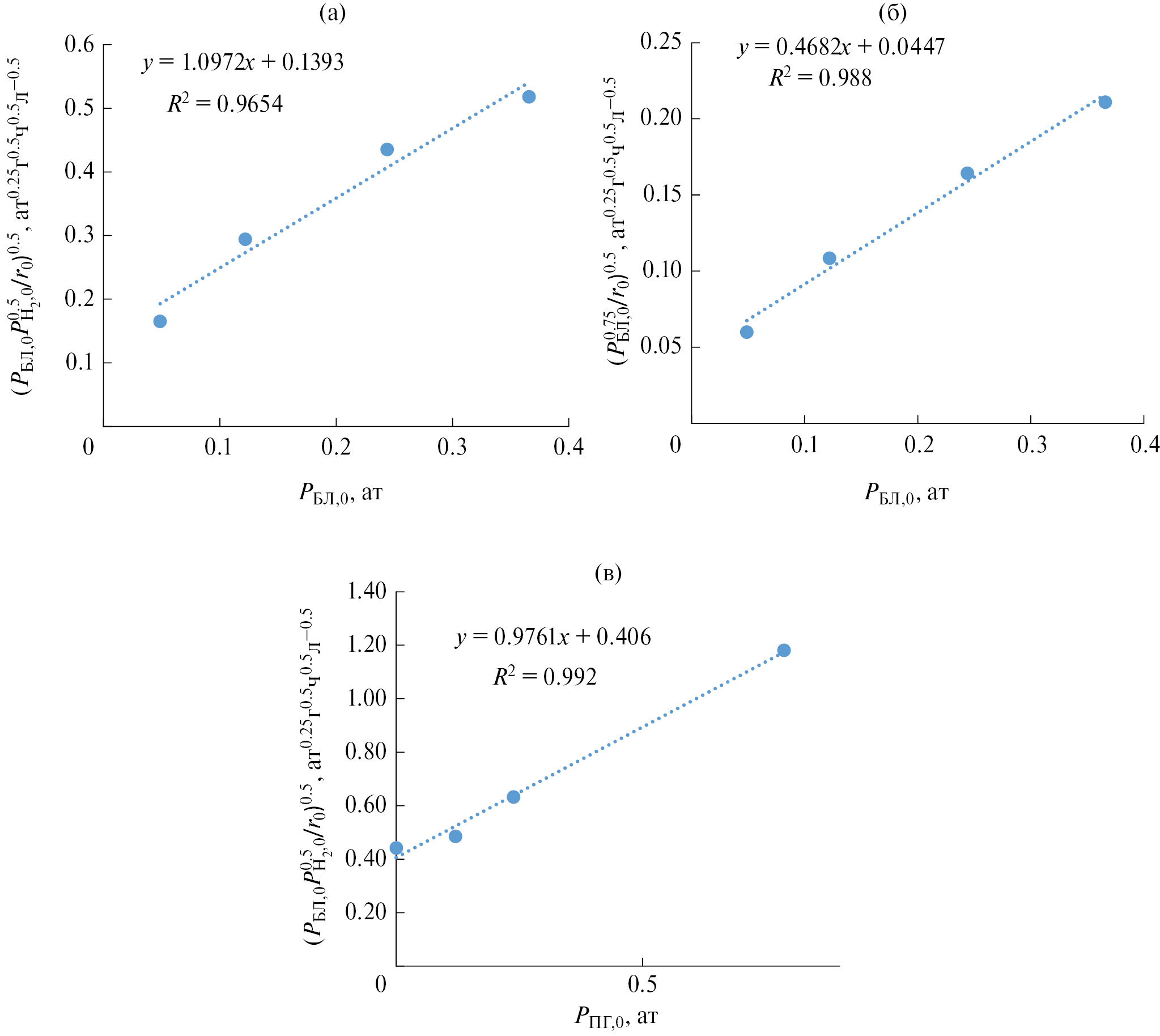 Рис. 6. Линейные корреляции, полученные при преобразовании кинетического уравнения: а – зависимость от PБЛ,0 для серии экспериментов с варьированием βH2; б – зависимость от PБЛ,0 для серии экспериментов с варьированием общего давления при βH2 = 40; в – зависимость от PПГ,0 для серии экспериментов с варьированием PПГ,0