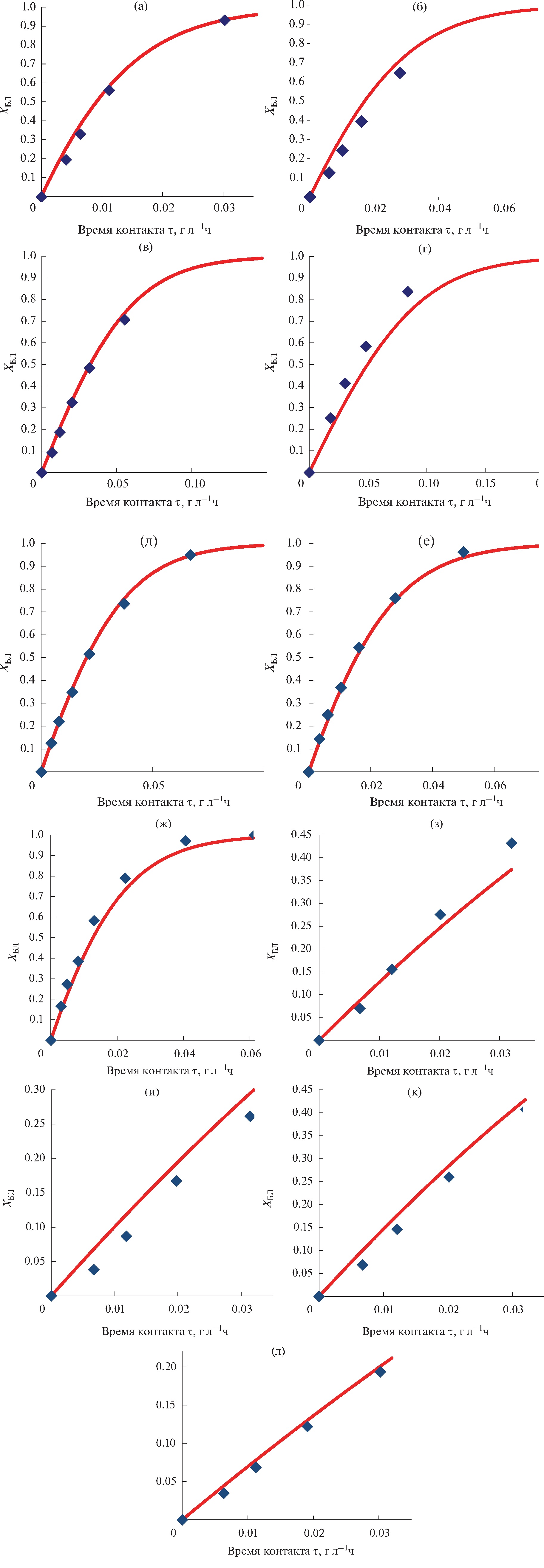 Рис. 7. Сравнение экспериментальных и расчетных значений конверсии бутиллактата от времени контакта при 180°С и следующих условиях: а – общее давление 2 ат, начальное мольное отношение водород : бутиллактат βH2 = 40; б – общее давление 5 ат, βH2 = 40; в – общее давление 10 ат, βH2 = 40; г – общее давление 15 ат, βH2 = 40; д – общее давление 10 ат, βH2 = 60; е – общее давление 10 ат, βH2 = 80; ж – общее давление 10 ат, βH2 = 100; з – общее давление 10 ат, βH2 = 40, βПГ = 0.5; и – общее давление 10 ат, βH2 = 40, βПГ = 1; к – общее давление 10 ат, βH2 = 40, βПГ = 0.25, βBuOH = 0.25; л – общее давление 10 ат, βH2 = 40, βПГ = 1.75, βBuOH = 1.75