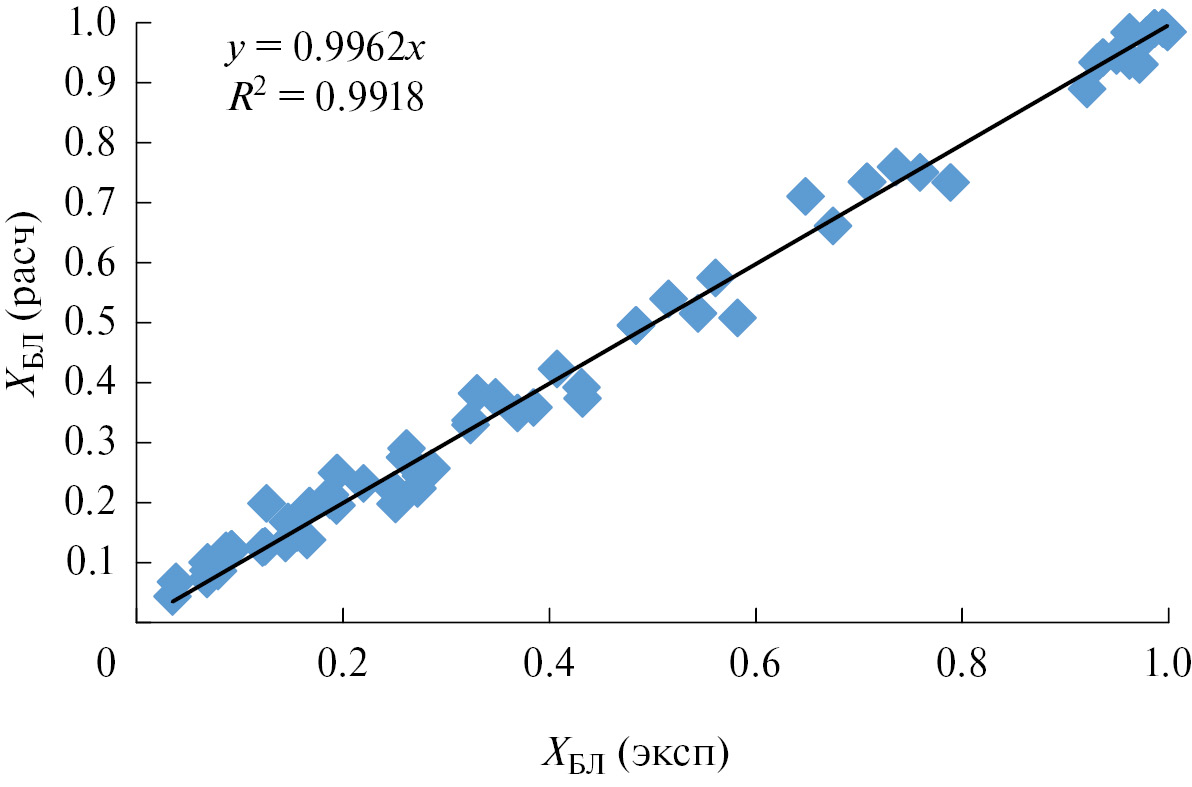 Из графика, представленного на рис. 8, видно, что коэффициент корреляции экспериментальных и расчетных значений конверсии бутиллактата для всего массива экспериментов равен 0.996 с высокой достоверностью аппроксимации R2 = 0.99. С учетом точности определения конверсии БЛ (отклонение от среднего значения в параллельных экспериментах составляло не более 5%) это свидетельствует об адекватности предложенной кинетической модели процесса с найденными значениями кинетических параметров.