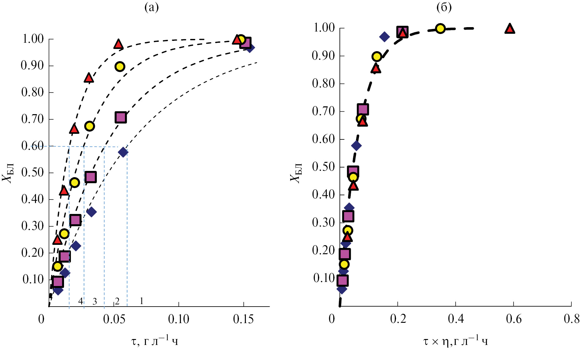 Рис. 9. Изменение конверсии бутиллактата от времени контакта (τ) (а) и приведенного времени контакта (η × τ) (б) при температурах 170 (♦), 180 (■), 190 (●) и 200°С (▲)