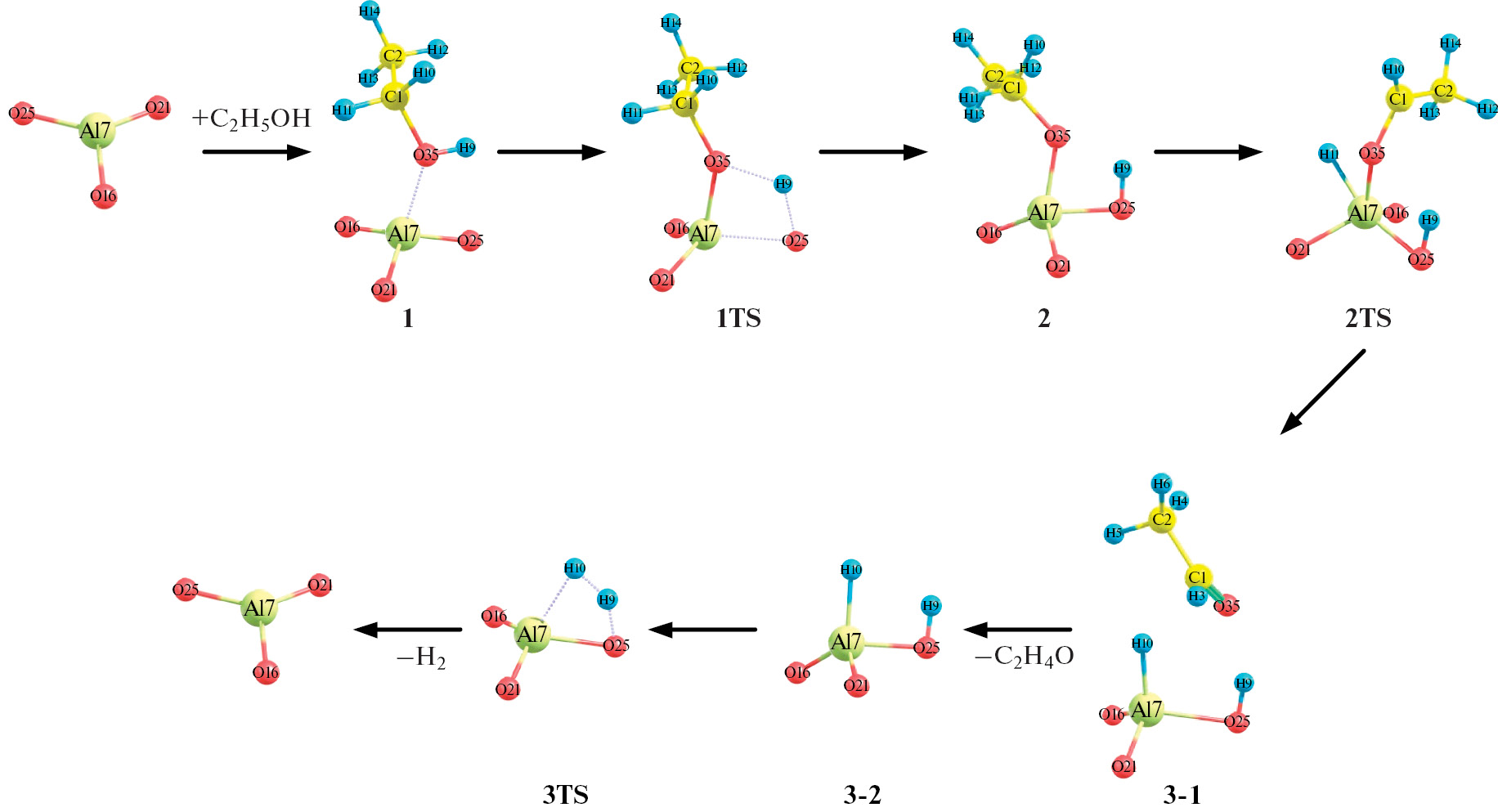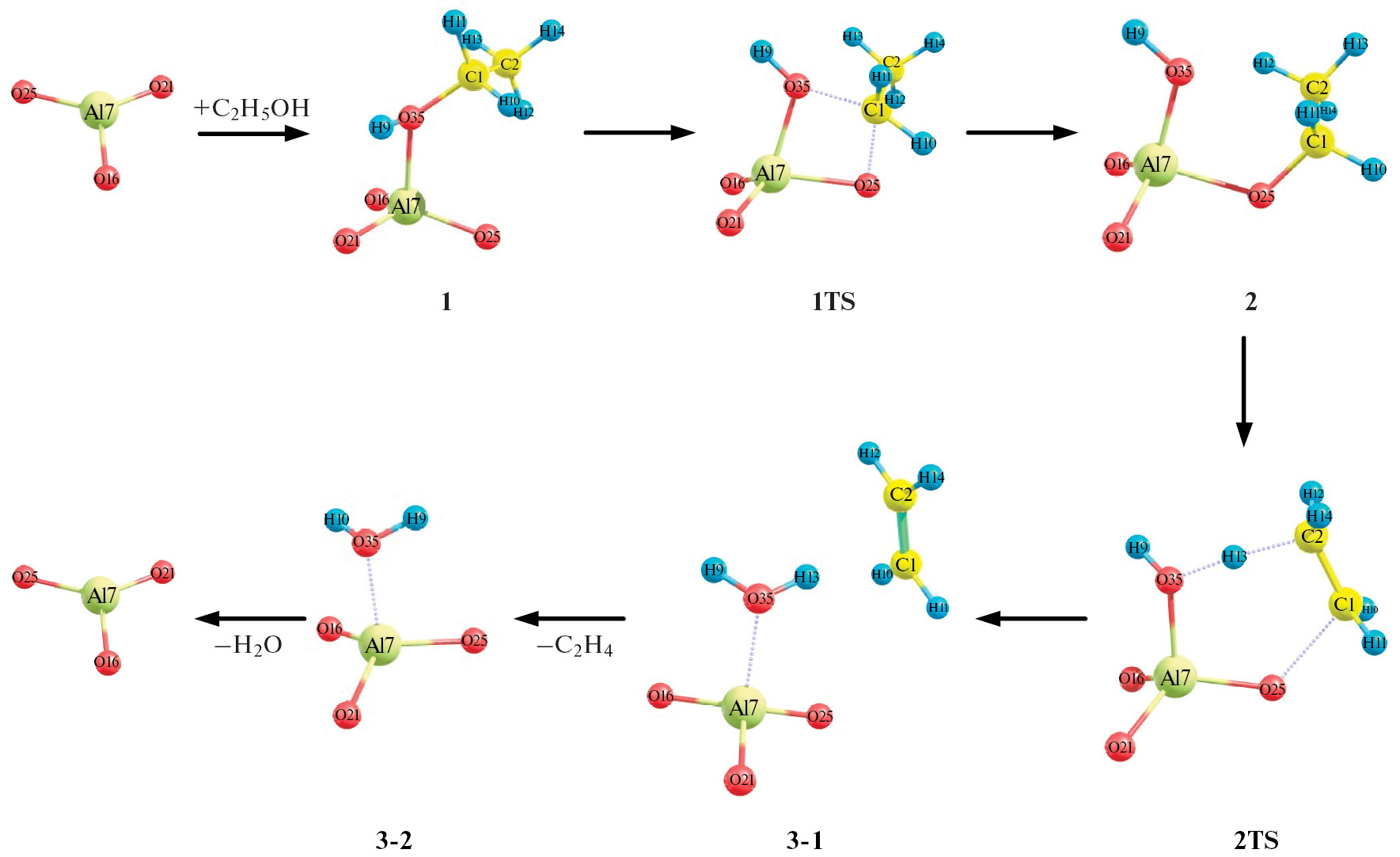Процесс получения ацетальдегида начинается с формирования адсорбционного комплекса 1 между молекулой спирта и кластером. Молекула спирта координируется с активным центром через кислород гидроксильной группы и ориентирована вдоль линии связи Al(7)–O(25). Изменение полной энергии при образовании адсорбционного комплекса составляет –12.9 ккал/моль. Длина образовавшейся связи Al(7)–O(35) равна 1.939 Å, что в среднем на 0.2 Å больше, чем длина аналогичных связей Al–O в кластере. Процесс адсорбции не приводит к видимым изменениям в геометрии кластера. Далее, через переходное состояние 1TS, происходит отрыв протона от OH-группы спирта и его перенос на атом О(25) в кластере с образованием структуры 2. Энергетический барьер этой стадии составляет 54.9 ккал/моль. Отрыв протона и образование этоксигруппы ведет к незначительным структурным изменениям кластера – длина связи Al(7)–O(25) увеличивается до 2.151 Å.
