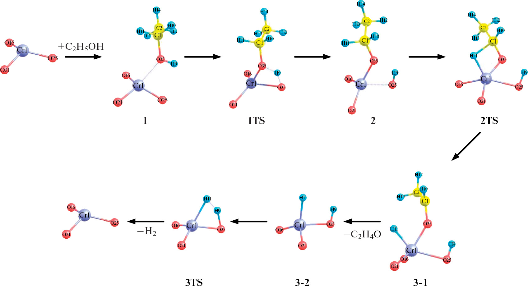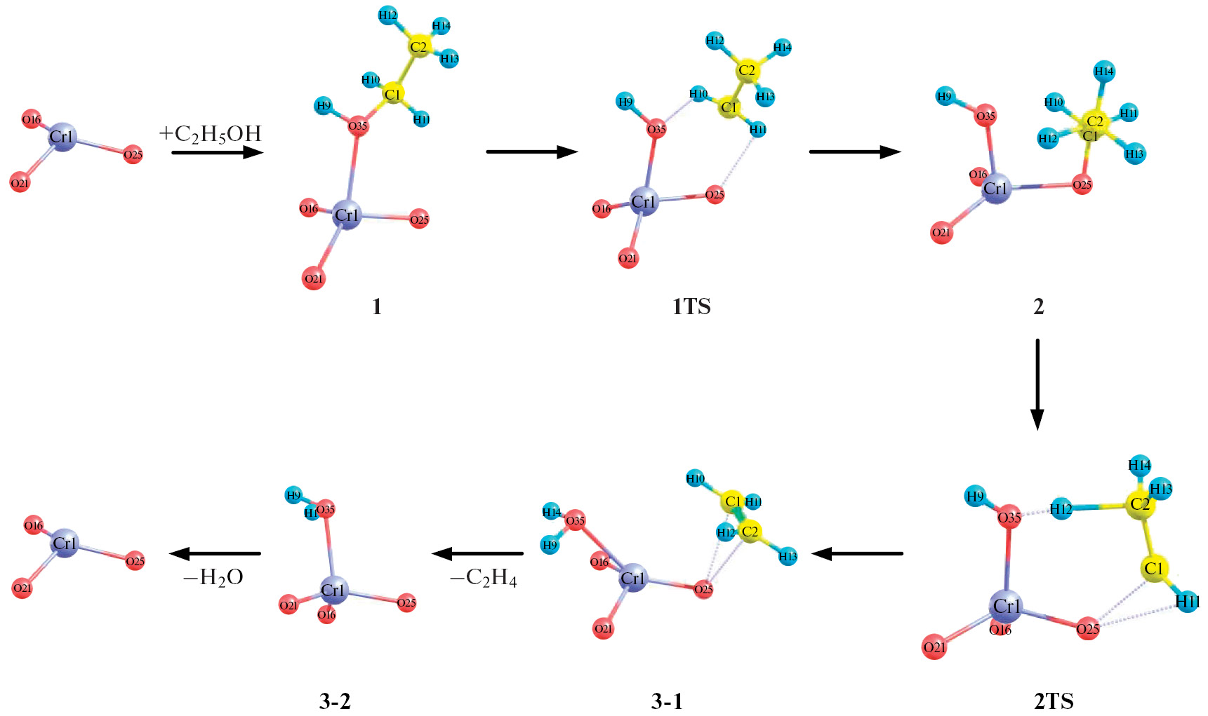 На следующем этапе появляется структура 2 через переходное состояние 1TS. Происходит активация О–Н-связи в молекуле этанола и перенос протона на кислород решетки с образованием связи О(26)–Н(9). Также незначительно увеличивается связь Cr(1)–O(25) до 2.146 Å, а связь Cr(1)–O(35), наоборот, становится короче – 1.856 Å. Энергетический барьер для данного превращения равен 40.1 ккал/моль.