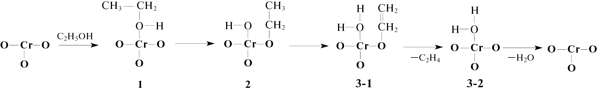Моделирование дегидратации этанола проведено для аналогичного кластера с атомом хрома, который был описан ранее при обсуждении процесса дегидрирования. Основные этапы образования этилена и воды из этанола представлены на схеме 4.