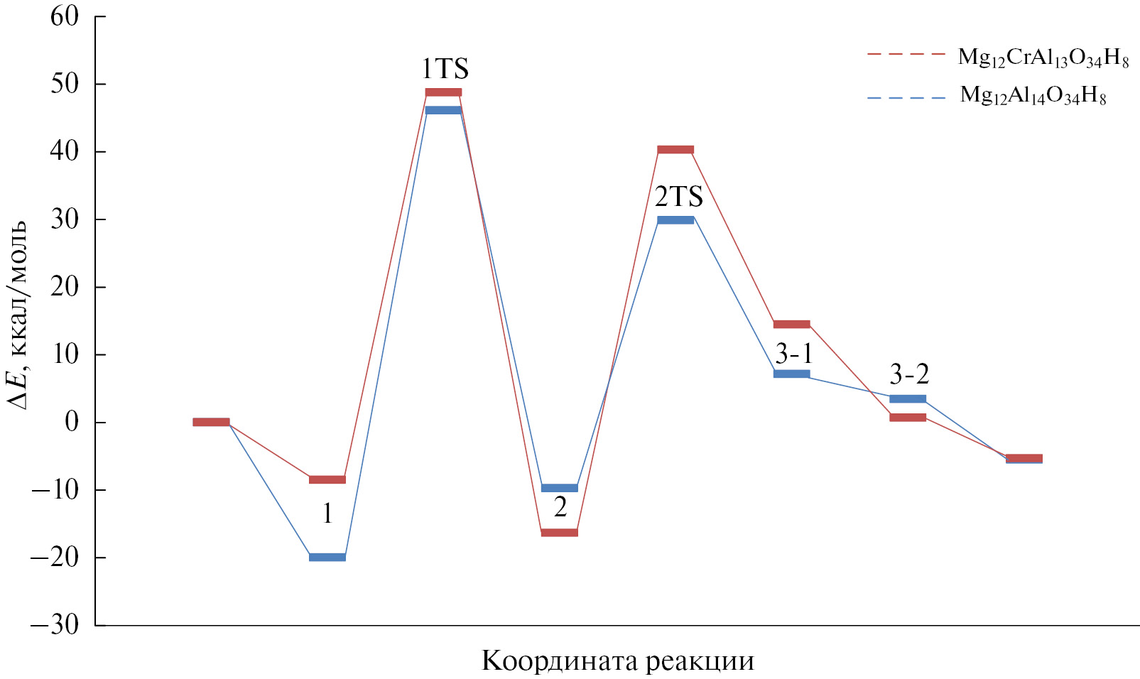 Процесс получения ацетальдегида на Mg12Al14O34H8 и Mg12CrAl13O34H8, несмотря на сходный путь протекания, имеет существенные различия по энергии. Наиболее энергетически затратная стадия для обоих рассмотренных вариантов – перенос протона от гидроксильной группы спирта к кислороду в локальном окружении координационно ненасыщенного металлического центра. Ее энергетический барьер составляет 54.9 ккал/моль (Mg12Al14O34H8) и 40.1 ккал/моль (Mg12CrAl13O34H8), соответственно. Разница в значениях энергетического барьера порядка 14.8 ккал/моль является достаточно существенной и позволяет предположить, что в условиях реакции конденсации этанола в бутанол-1 активные центры, связанные с хромом, будут более эффективны в процессе дегидрирования этанола, чем центры, связанные с алюминием, в исходном смешанном оксиде. Анализ изменения полной энергии для дегидрирования этанола представлен на рис. 6.