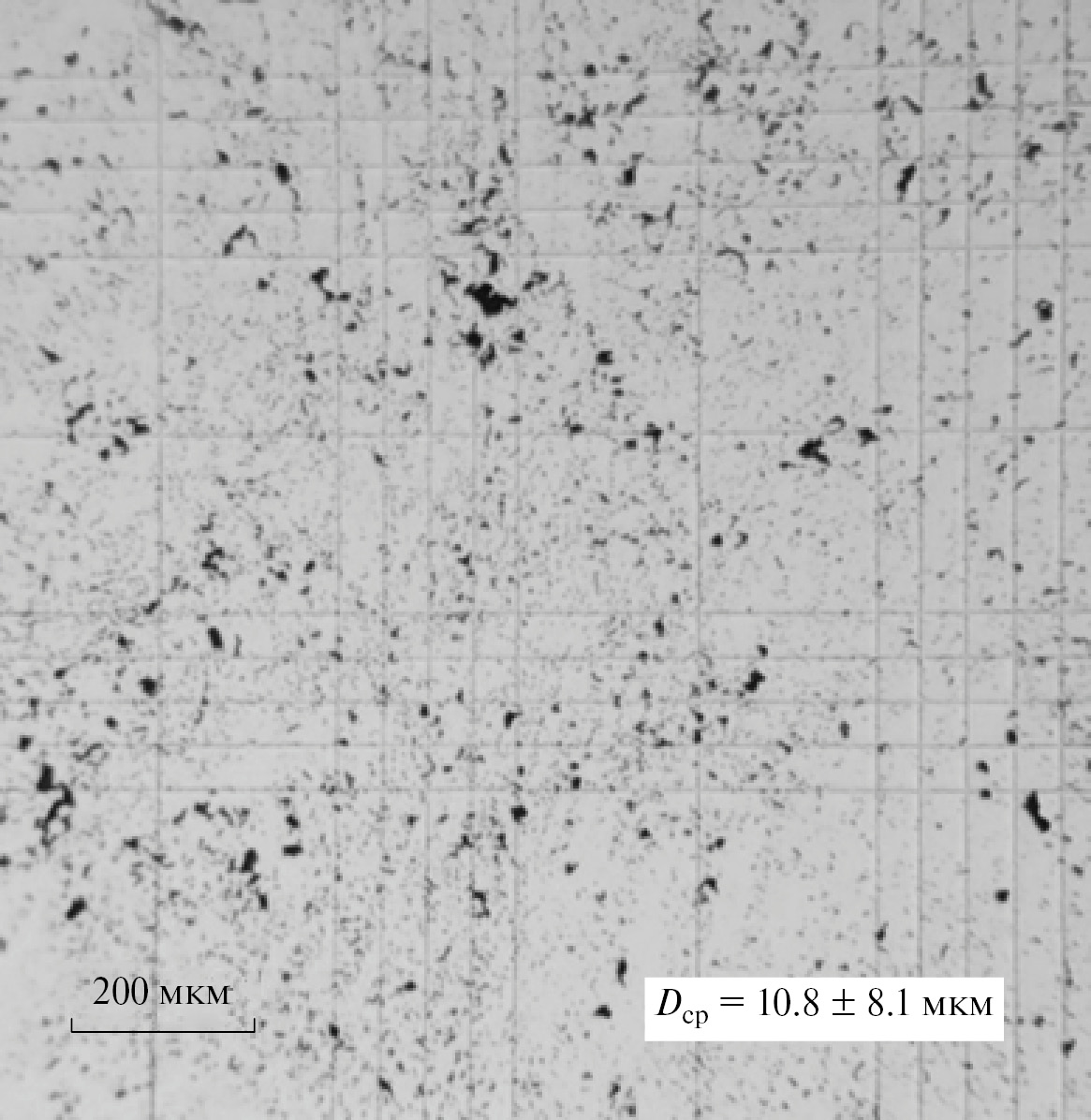 На рис. 1 представлена фотография полимера SНФ, полученная в камере Горяева. Средний размер частиц SНФ приближенно оценен в 10.4 ± 9.0 мкм.