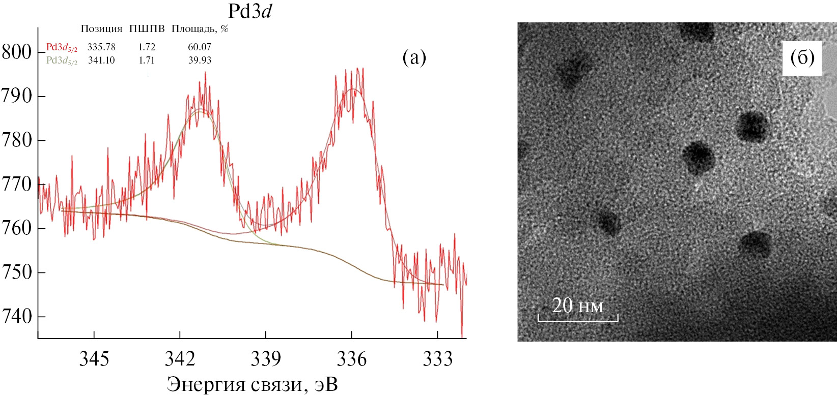 Методом РФЭС обнаружено, что на поверхности полимера SНФ присутствует сера (1.7 ат. %) в виде SO3H-групп: энергия связи (Есв) S2p3/2 составляет 168.7 ± 0.1 эВ. В ходе РФЭС-исследования восстановленного катализатора 1% Pd/SНФ-R на поверхности образца был найден металлический палладий с Есв(Pd3d5/2) = 335.8 ± 0.1 эВ (рис. 2а). Методом ПРЭМ (рис. 2б) подтверждено наличие в составе 1% Pd/SНФ-R наночастиц палладия со средним диаметром 8.3 ± 2.7 нм.