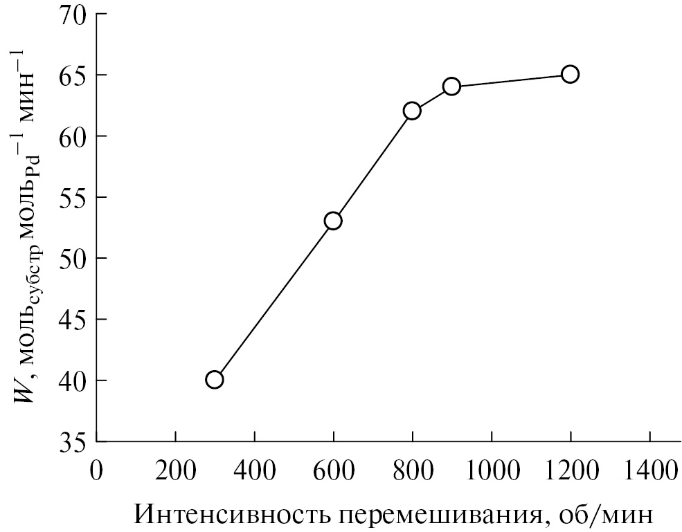 Известно, что протекание гомогенно-каталитических процессов слабо зависит от скорости перемешивания, однако в случае суспензии твердого катализатора на наблюдаемые кинетические закономерности могут оказывать воздействие как внешнедиффузионные, так и внутридиффузионные факторы. На примере реакции кросс-сочетания 4-броманизола и фенилбороновой кислоты, которую проводили при 60°С с использованием NaOH в качестве основания, в присутствии предварительно восстановленной каталитической системы 1% Pd/SНФ-R, содержащей НЧ палладия (см. выше), исследовано влияние интенсивности перемешивания в диапазоне 300–1200 об/мин. Обнаружено (рис. 3), что с увеличением скорости перемешивания от 300 до 800 об/мин происходит линейный рост наблюдаемой каталитической активности W, а в диапазоне от 900–1200 об/мин активность не зависит от этого показателя. Можно сделать вывод, что проведение реакции при скорости перемешивания 900 об/мин и выше позволяет устранить внешнедиффузионные ограничения. Что касается внутридиффузионных ограничений, то, поскольку выбранный полимер является тонкодисперсным (рис. 1) и хорошо смачивается выбранными растворителями, было сделано предположение об отсутствии внутридиффузионных ограничений.