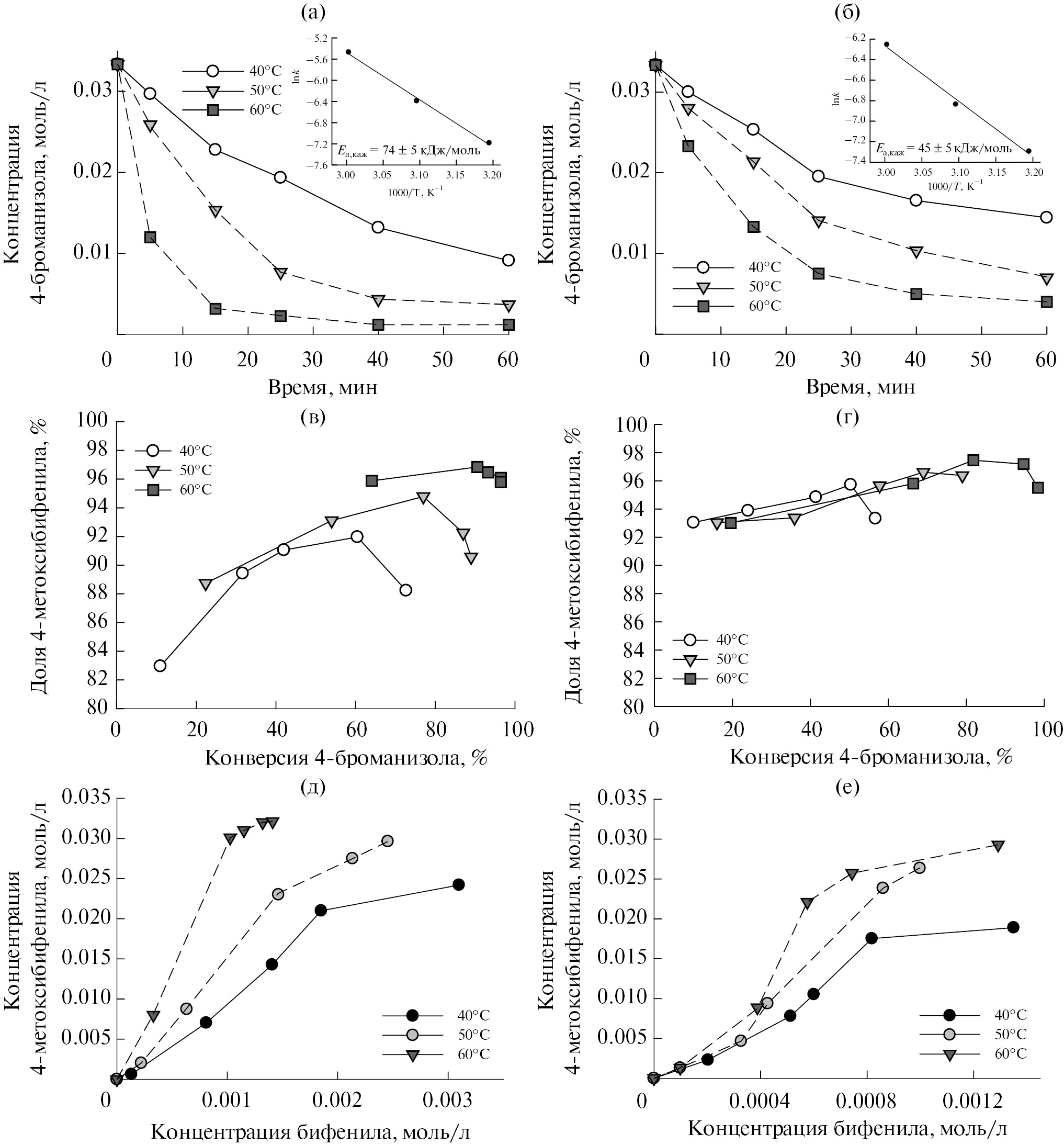 Рис. 4. Зависимости концентрации 4-броманизола от времени (а, б), доли продукта кросс-сочетания в смеси с продуктом гомосочетания (бифенилом) от конверсии 4-броманизола (в, г), а также соответствующие фазовые траектории (д, е) при варьировании температуры реакции в присутствии исходного 1% Pd/SНФ (а, в, д) и восстановленного 1% Pd/SНФ-R (б, г, е) образцов