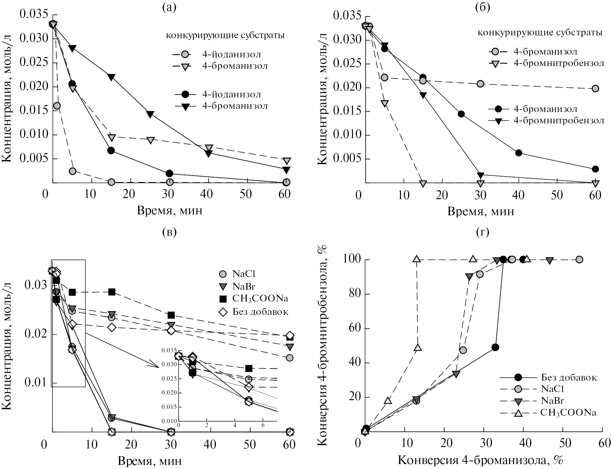Рис. 5. Кинетические кривые зависимости концентрации арилгалогенидов от времени в условиях конкурирующих субстратов: 4-иоднаизола и 4-броманизола (а), 4-бромнитробензола и 4-броманизола (б), а также влияние добавок солей натрия на зависимость концентрации 4-бромнитробензола (сплошные линии) и 4-броманизола (пунктирные линии) от времени (в) и фазовые траектории (г) в присутствии катализатора 1% Pd/SНФ-R