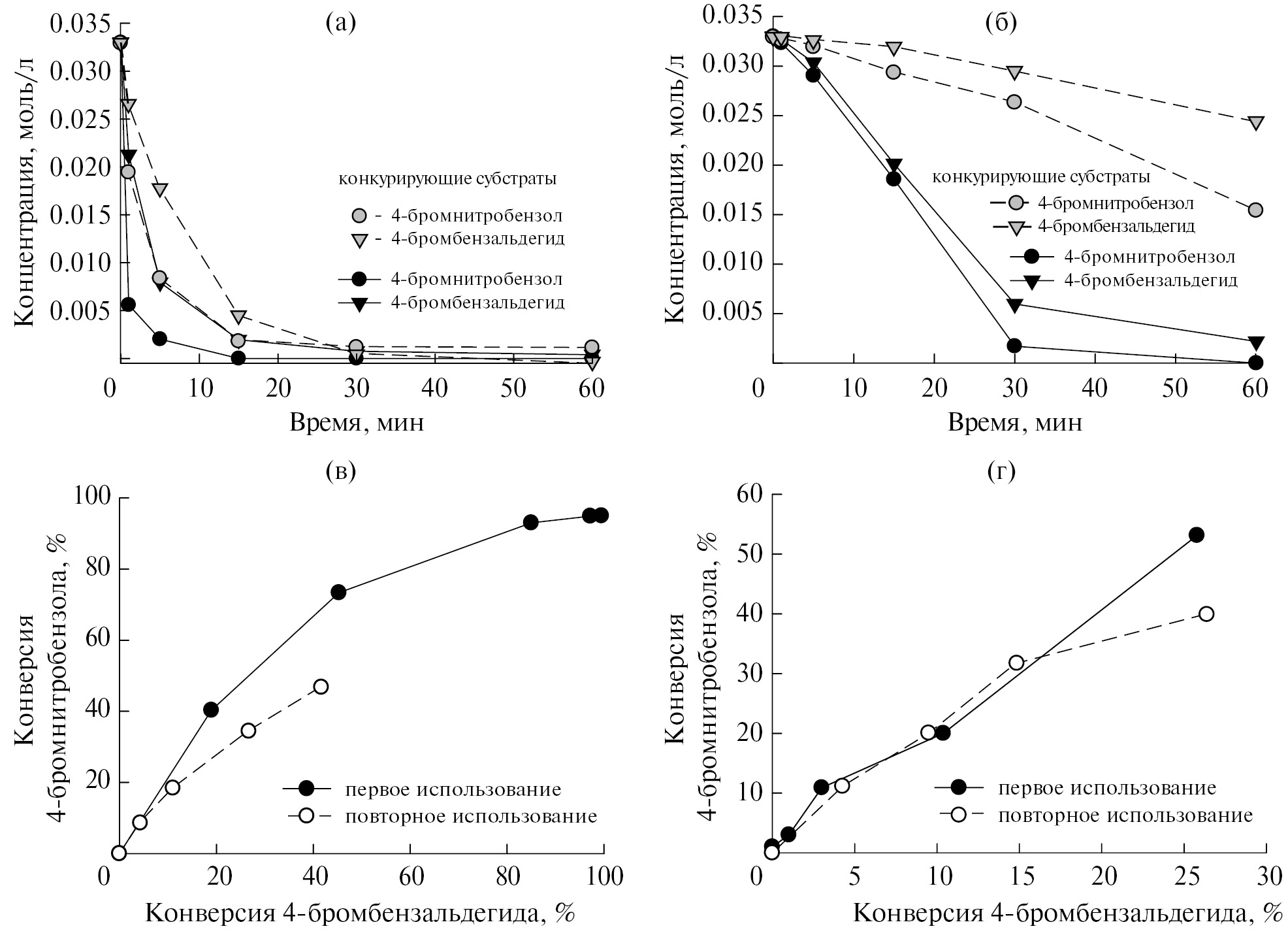 Рис. 6. Сравнение зависимостей концентраций 4-бромнитробензола и 4-бромбензальдегида от времени в отдельных экспериментах (черные символы) и в условиях конкурирующих субстратов (серые символы) в присутствии исходного 1% Pd/SНФ (а) и восстановленного 1% Pd/SНФ-R (б) катализаторов, а также соответствующие фазовые траектории, полученные при первом и повторном использовании образцов 1% Pd/SНФ (в) и 1% Pd/SНФ-R (г) в условиях конкурирующих субстратов