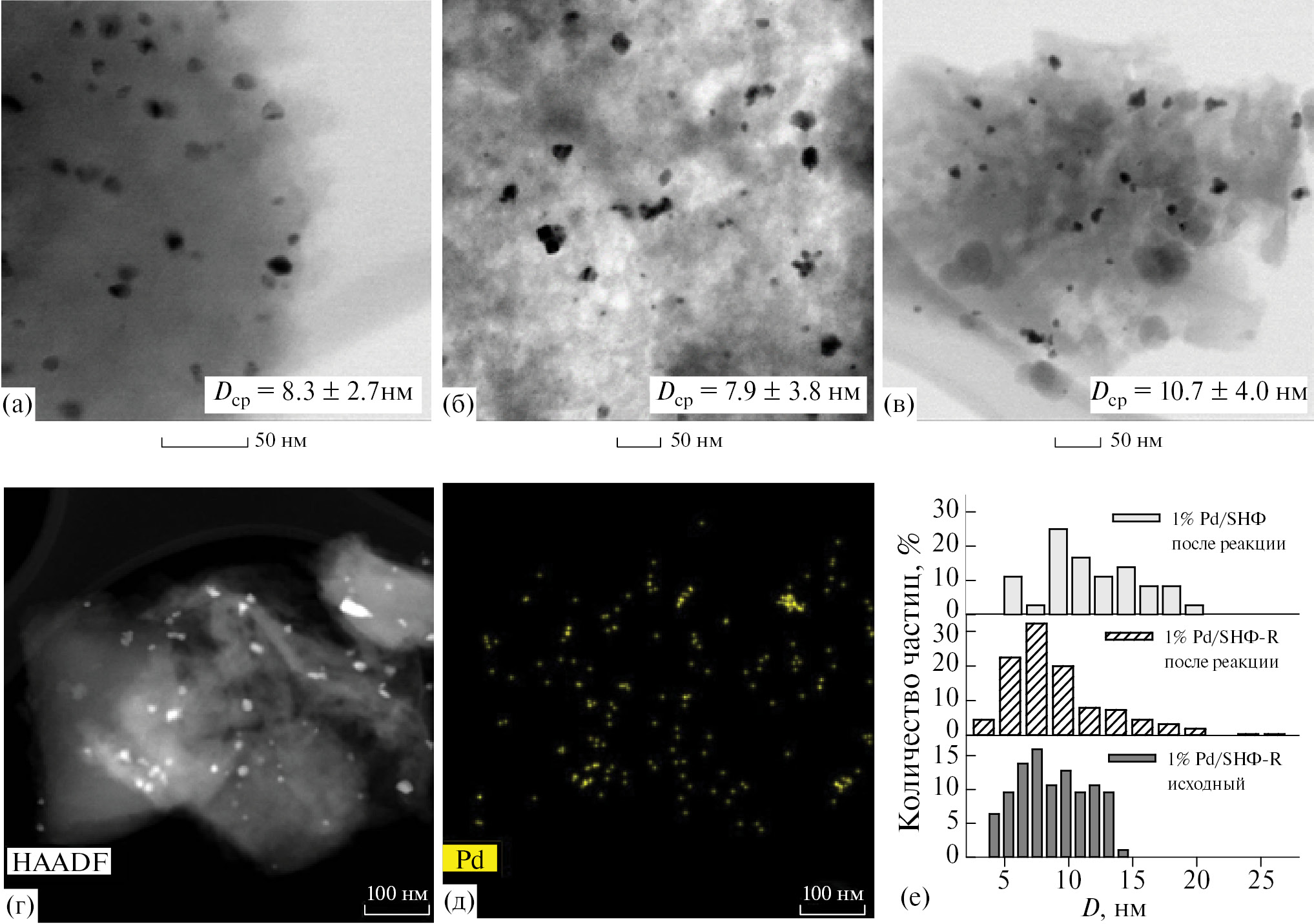 Рис. 7. Светлопольные ПРЭМ-изображения исходного 1% Pd/SНФ-R (а) и образцов 1% Pd/SНФ-R (б) и 1% Pd/SНФ (в) после реакции Сузуки в условиях конкурирующих субстратов (4-бромнитробензола и 4-бромбензальдегида); пример темнопольного снимка (г) и ЭДС-картирования по Pd (д) для катализатора 1% Pd/SНФ-R после реакции, а также гистограммы распределения частиц по размерам в образцах (е)
