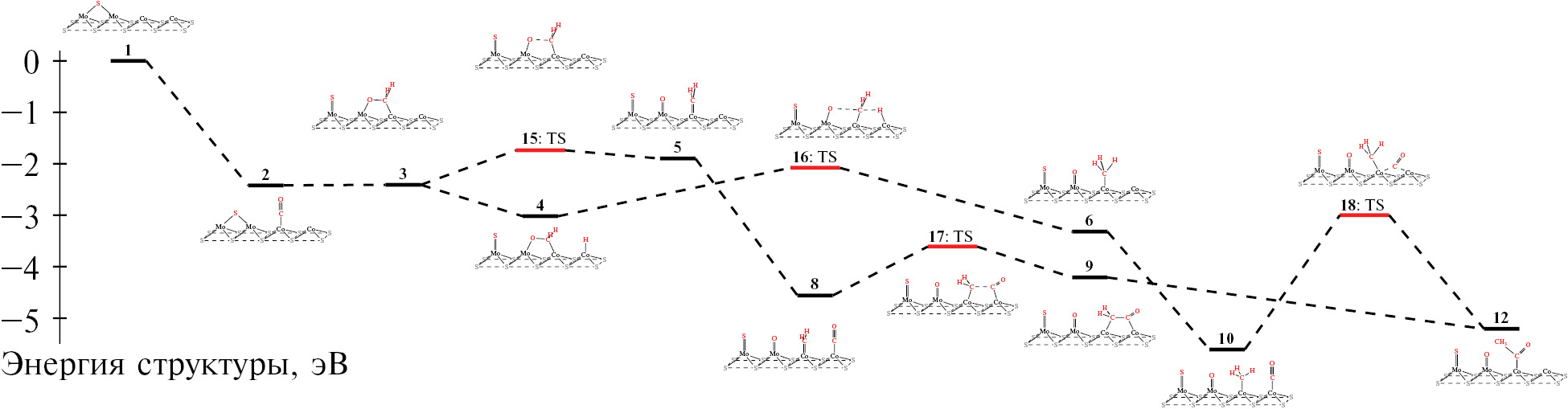 Далее CO гидрируется до альдегидоподобного интермедиата 3. Этот процесс не моделировали, гидрирующая активность молибденсульфидных катализаторов хорошо известна. Альдегидподобный интермедиат адсорбирован кислородом на атоме молибдена и углеродом на атоме кобальта. Энергия структуры с адсорбцией углеродом на атоме молибдена на ~1 эВ выше для структуры без калия. Мы рассматриваем это как проявление высокой оксофильности атома молибдена, которая должна облегчить разрыв связи C–O.