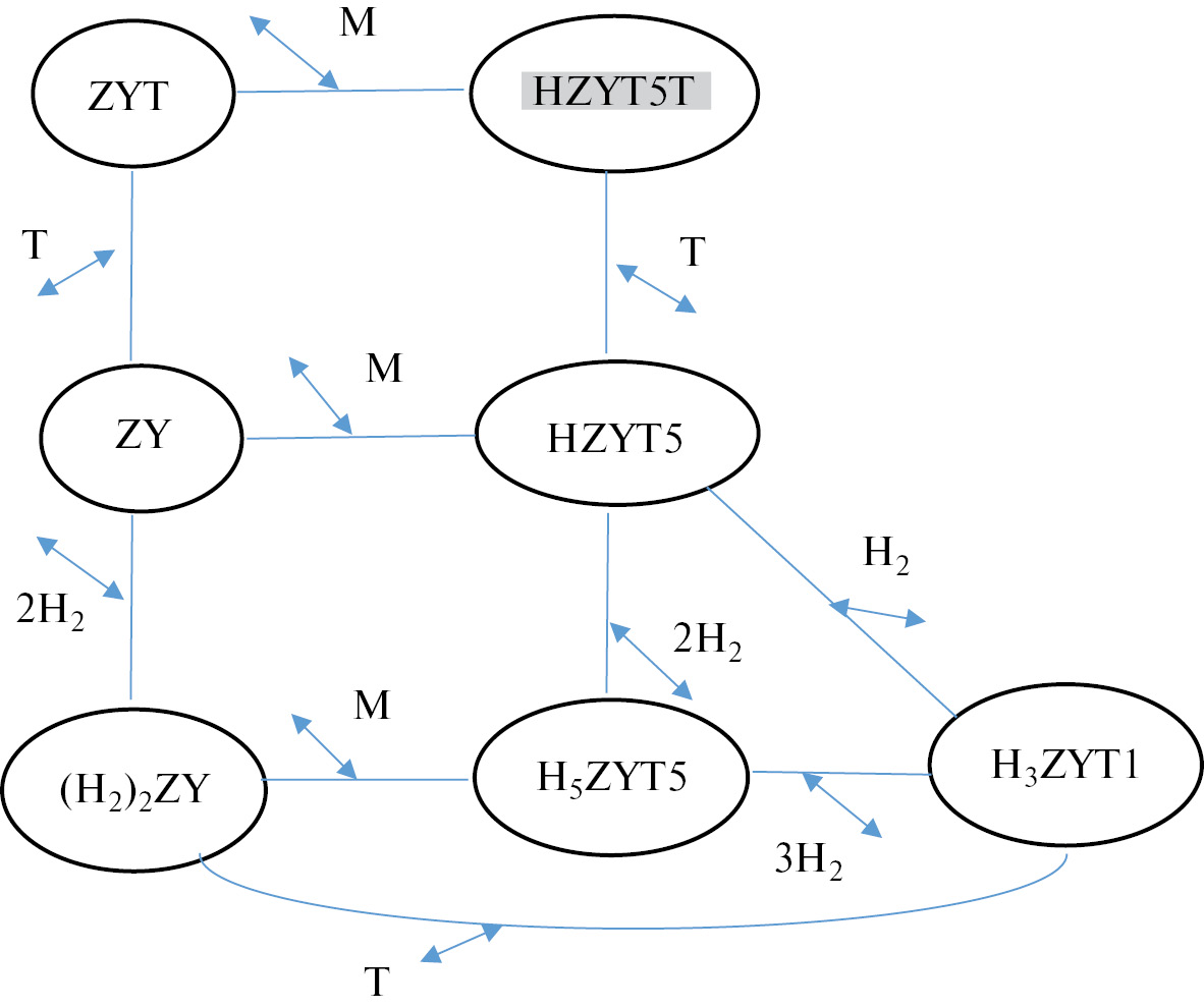 Ранее нашей группой была предложена адекватная эмпирическая модель дегидрирования М на катализаторе Pt,Sn/γ-Al2O3, включающая обратное направление реакции [3]. Проверкой пяти десятков гипотез о механизме реакции было установлено, что простейшее адекватное описание данных планированного кинетического эксперимента возможно моделью с четырьмя маршрутами превращения реагента в продукты и обратно. План эксперимента включал независимое варьирование всех начальных концентраций (парциальных давлений) участников реакции (в том числе с использованием инертного газа аргона для сохранения начальных парциальных давлений участников реакции при варьировании парциального давления одного из них), времени контакта (объемной скорости) и температуры. Согласно механизму (модели) превращения происходят на бифункциональном АЦ (ZY) и двух его адсорбционных формах – с T и с двумя молекулами водорода. В прямом направлении реакции участвуют все три формы АЦ (три маршрута), а в обратном направлении основную роль играет “водородная” форма АЦ ((Н2)2ZY). Модель имеет недостаток в части описания положения равновесия реакции – оно зависит, хотя и достаточно слабо, от начальных концентраций реагентов.