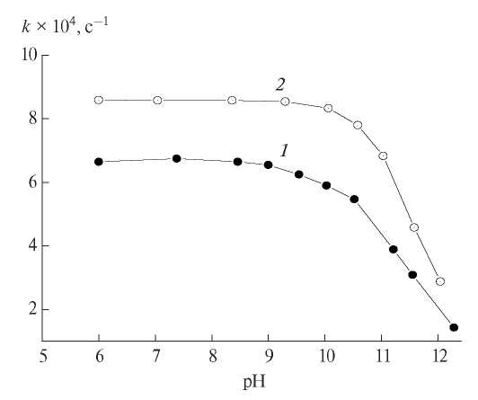 Рис. 1. рН-Зависимости констант скорости окисления Et2S в системах: 1 – Н2О2 (0.03 моль/л), 2 – Н2О2 (0.03 моль/л)–NaНСО3 (0.006 моль/л) [22].
