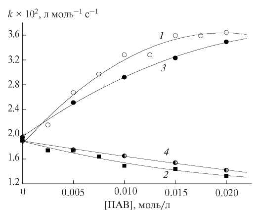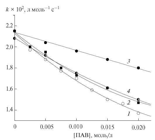 Рис. 3. Зависимости констант скорости окисления диэтилсульфида пероксимонокарбонатом от концентрации ПАВ: ЦТАБ (1), тритона (2), ГК-МЦИХ (3) и ДСН (4) [23].