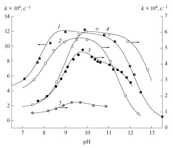 В реакциях с пероксоборатом и бикарбонатом натрия рН-зависимости констант скорости имеют колокообразный вид с максимумом при рН ~10, причем во всей области изменения кислотности значения констант скорости для системы ПБ–НСО3– выше, чем в отсутствие добавок бикарбоната (рис. 7, кривые 3 и 4) [22].