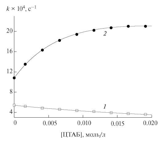 Рис. 5. Зависимости констант скорости окисления Et2S пероксидом водорода (1) и в системе Н2О2 (0.02 моль/л)– –В(ОН)3 (0.02 моль/л) (2) от концентрации ЦТАБ. Условия: рН 9.0; 25°C [28].