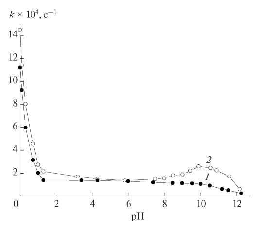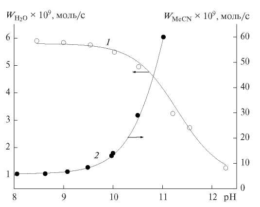 Рис. 8. рН-Зависимости начальных скоростей окисления Et2S пероксидом водорода в водных растворах (1) и в смеси Н2О–MeСN ([MeСN] = 1 об. %) (2). Условия: [H2O2] = = 0.006 моль/л, [Et2S] = 4.2 × 10-5 моль/л; 25°С [29].