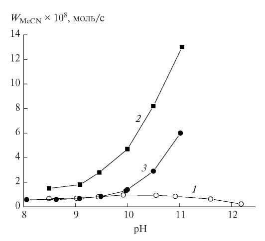 Скорость реакции Et2S с пероксоборатом натрия в растворах Н2О–MeСN при постоянном значении рН линейно растет с увеличением концентрации ПБ и MeСN. В отличие от водных растворов, скорость реакции Et2S с ПБ в смеси Н2О–MeСN (1 об. %) экспоненциально возрастает с уменьшением кислотности среды (рис. 9, кривая 2) и при рН 11 почти в 20 раз превышает скорость окисления диэтилсульфида пероксоборатом натрия в воде. В области рН 8–9 скорость окисления Et2S пероксоборатом натрия в растворах Н2О–MeСN слабо зависит от кислотности среды, как и в системе Н2О2–MeСN–Н2О (рис. 9, кривая 3).