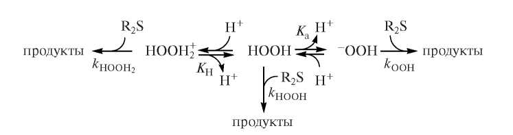 Значения констант скорости реакций тиоэфира в слабокислотных, нейтральных и щелочных средах (рН 2–12) [13] с участием частиц НООН, –НОО составляют kHOOH = 2.8 × 10–2 л моль–1 с–1 и k–HOO = 0.42 × 10–2 л моль–1 с–1 соответственно. При рН < 1 реакция с участием НООН2+ протекает с константой скорости kHOOH2 = 244 л моль–1 с–1. Однако такие системы с высокой кислотностью имеют проблемы в их практическом применении.