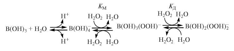 Эффективным активатором Н2О2 в окислении диэтилсульфида является борная кислота. Активирующий эффект В(ОН)3 связывают [20, 24–26] с образованием активных анионов монопероксобората В(ОН)3(ООН)– (MПБ) c константой равновесия КM и дипероксобората В(ОН)2(ООН)2– (ДПБ) c константой равновесия KД (схема 3):
