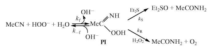 Установлено [29], что при рН 8–9 скорость окисления в растворах Н2О–MeСN слабо зависит от кислотности среды и близка к соответствующим значениям в воде (рис. 8). При рН > 10 скорость убыли Et2S в системе вода–ацетонитрил ([МеCN] = 1 об. %) почти в 15 раз превышает скорость окисления диэтилсульфида пероксидом водорода в воде [29]. Активирующее действие ацетонитрила связывают с образованием в щелочных средах активированных форм Н2О2 (пероксиимидной кислоты МеC(O2H)=NH2 или пероксиимидата МеC(O2H)=NH–)–PI, продуктов взаимодействия –ООН с MeСN) [30–33] (схема 4).