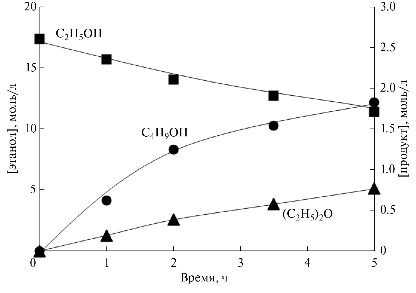 По данным газо-жидкостной хроматографии и хромато-масс-спектрометрии спустя 2 ч реакции содержание бутанола-1 в продуктах реакции в присутствии 0.2% Cu/0.3% Pd/5% MO/Al2O3 (M = Ca, Sr, Ba) составляет 67–77%. В составе жидкой фракции обнаружены этаналь и бутаналь (1.7–3.2%). Эти соединения являются интермедиатами целевого процесса по известному механизму, включающему дегидрирование этанола в этаналь, конденсацию этаналя в 2-бут-2-еналь и гидрирование 2-бут-2-еналя в бутанол-1 [3–4]. В смеси продуктов идентифицированы этоксиэтан (4–5%), а также сложные эфиры (этилацетат, диэтоксиэтан, этоксибутан, этилбутират, бутилацетат и др), разветвленные насыщенные спирты (2-этилбутанол, 2-этилгексанол) и углеводороды С5+ различного строения (1–1.5%). Количество образующихся газообразных продуктов на порядок меньше, чем количество продуктов в жидкой органической фракции. В составе газов преобладают водород, метан и CO, кроме того, в небольших концентрациях содержатся углеводороды С1–С4 и СO2.