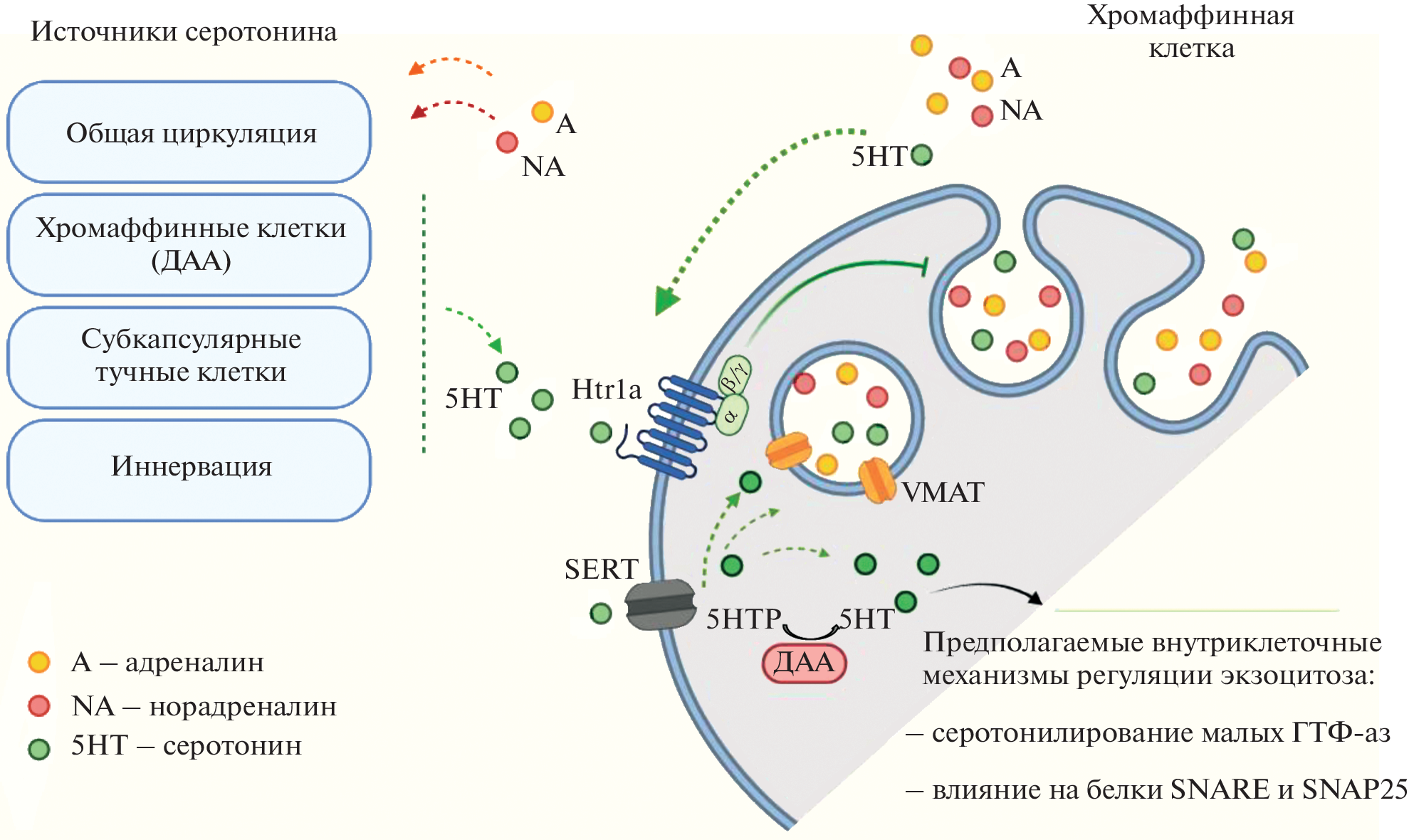 - Verhofstad A.A.J., Jonsson G. Immunohistochemical and neurochemical evidence for the presence of serotonin in the adrenal medulla of the rat // Neuroscience. 1983. V. 10. № 4. P. 1443–1453.https://doi.org/10.1016/0306-4522(83)90125-2