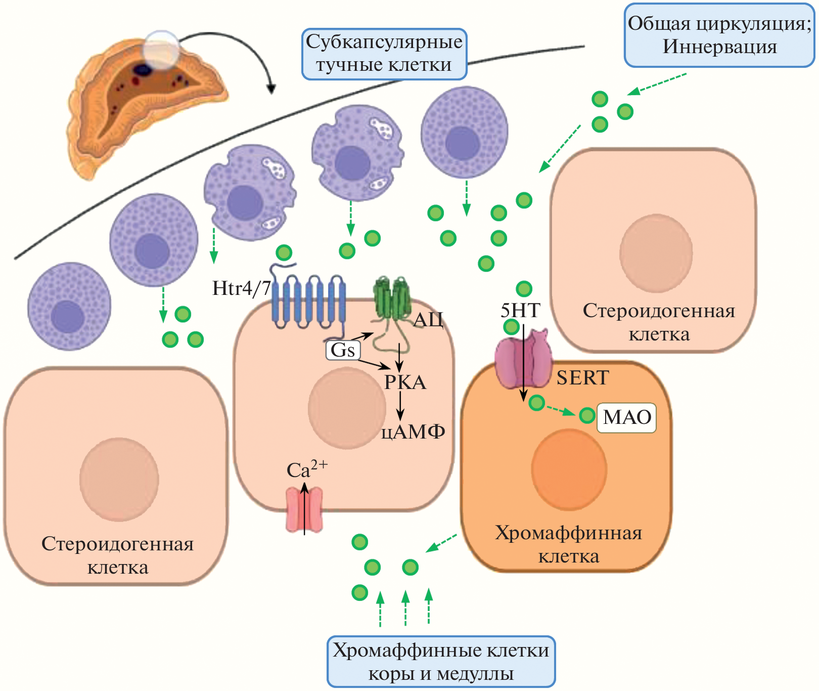 Серотонин является не только нейротрансмиттером, но и важным гуморальным регулятором разнообразных физиологических процессов за пределами центральной нервной системы. В последнее десятилетие складывается концепция существования локальных серотонинергических систем в периферических органах, где серотонин реализует свое воздействие через аутокринно-паракринные механизмы. Такие локальные системы уже описаны в поджелудочной железе, тимусе, молочной железе, красном костном мозге. Мы считаем, что подобная локальная серотонинергическая система характерна и для надпочечников. Эти парные органы являются ключевым компонентом эндокринной системы млекопитающих, обеспечивающим комплексную физиологическую реакцию на стресс. Надпочечники состоят из двух неродственных по происхождению и функциям отделов – коры и медуллы, при этом серотонин играет важную роль в регуляции секреции гормонов в обеих этих структурах. Цель данного обзора – анализ структуры локальной серотонинергической системы в надпочечнике, а также ее роли как в регуляции функций надпочечников у взрослых животных, так и в их формировании в эмбриогенезе. Обобщение имеющихся данных позволяет говорить о том, что наличие локальной серотонинергической системы делает орган восприимчивым к колебаниям уровня циркулирующего в крови серотонина на всех этапах онтогенеза. Таким образом, локальная чувствительность к серотонину обеспечивает возможность системной гуморальной координации формирования и функционирования как надпочечников, так и других периферических органов. В этом аспекте становится понятна важность локальных серотонинергических систем для медицины и биологии развития.