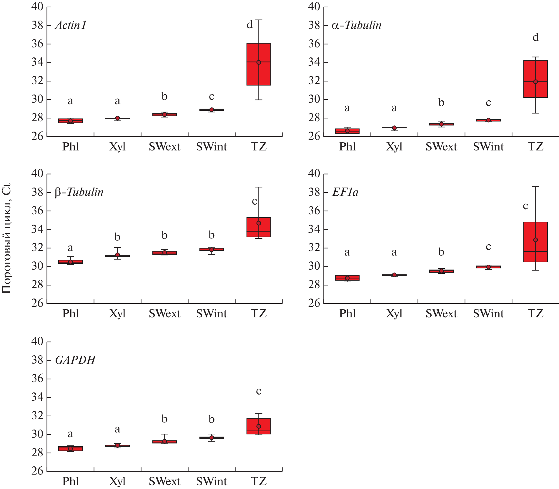 Scots pine (Pinus sylvestris L.) is a species of tree with heartwood (HW), which is forming during aging of sapwood (SW). Due to clear-cut border between SW and HW P. sylvestris should be used as a model woody plant for studying patterns of HW formation. Currently, molecular genetic methods are used to study the processes of trunk tissues formation in woody plants often. A feature of trunk tissues of coniferous trees is a high content of secondary metabolites, a low content of nucleic acids, and potential partial degradation of RNA. In this work we discuss the choice of most successful method for extraction a high-quality RNA for real-time PCR (RT-PCR) in P. sylvestris trunk tissues along the radial vector “conductive phloem/cambial zone – differentiating xylem – exterior part of SW (1–2 annual rings) – interior part of SW (1–2 annual rings afore transition zone (TZ)) – TZ (2 annual rings afore HW)” for reproducible RT-PCR data. The expression stability of six potential reference genes (Actin1, α-Tubulin, β-Tubulin, Ef1a, GAPDH, UBQ) was assessed in all describe tissues. Differences in expression levels of target genes are shown by data normalization using reference genes with different stability of expression.