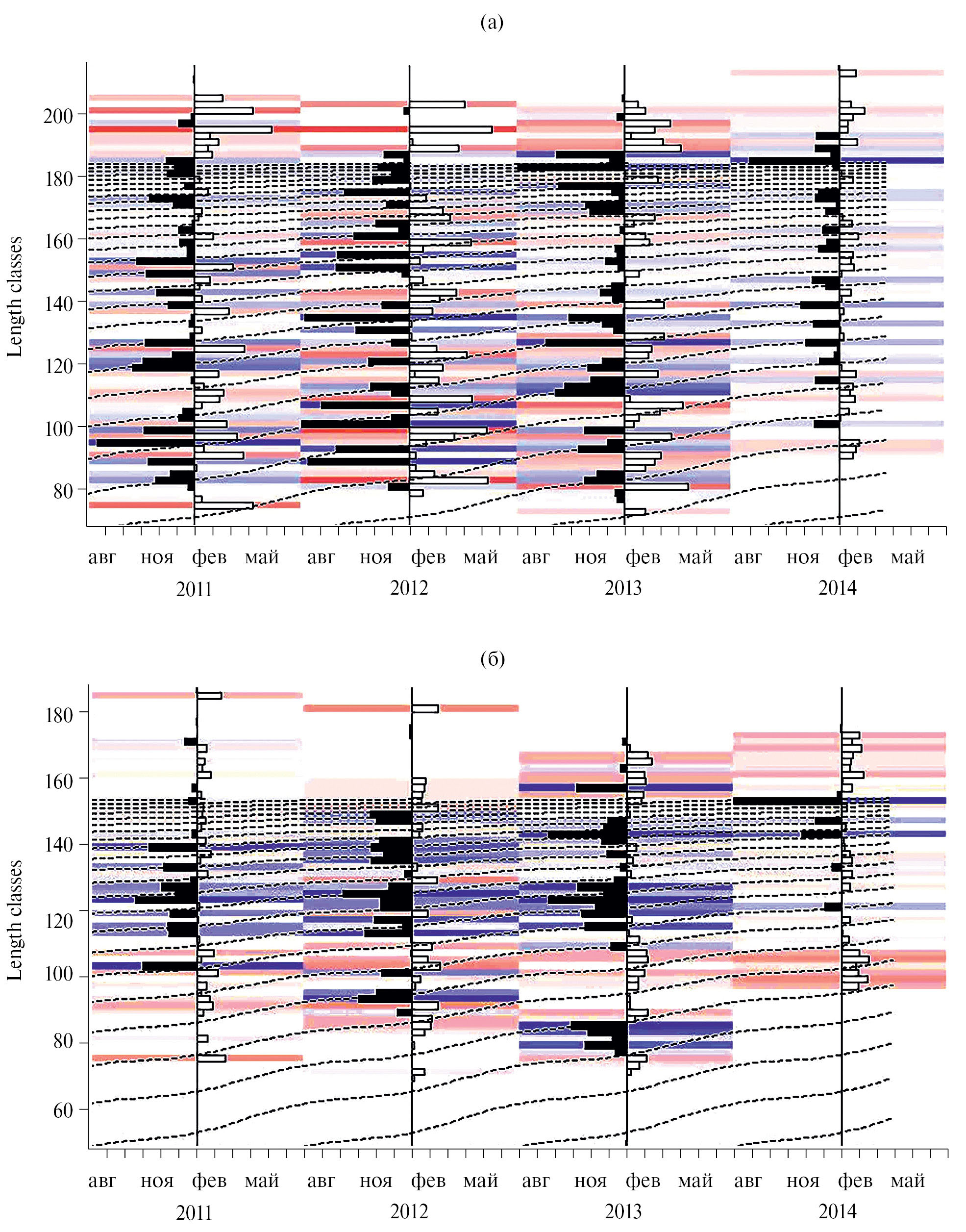 Произведены расчеты показателей линейного роста синего краба по уравнению (2), включая размеры ШК в когортах (CWt, мм), теоретическое предельное значение ШК (CWinf, мм), константу роста (К, год-1) и гипотетический возраст краба при ШК равной 0 (t0). Для расчетов был использован статистический пакет TropFishR в R, который дополняет метод ELEFAN (Electronic length frequency analysis) для анализа размерного распределения и определения параметров уравнения роста Берталанфи (R Core Team, 2016; Taylor, Mildenberger, 2017). Пакет TropFishR также использует алгоритмы оптимизации по генетическому алгоритму для поиска параметров в многомерном пространстве разных временных периодов, что позволяет определить пики и пробелы в распределении размерных частот и корректирует кривую роста, проходящую через максимальное их количество (Scrucca, 2013; Scrucca, 2016). Рассчитанное число пиков мы отождествляли с возрастной структурой крабов, так как для каждого из возрастов характерен пик нормального распределения.