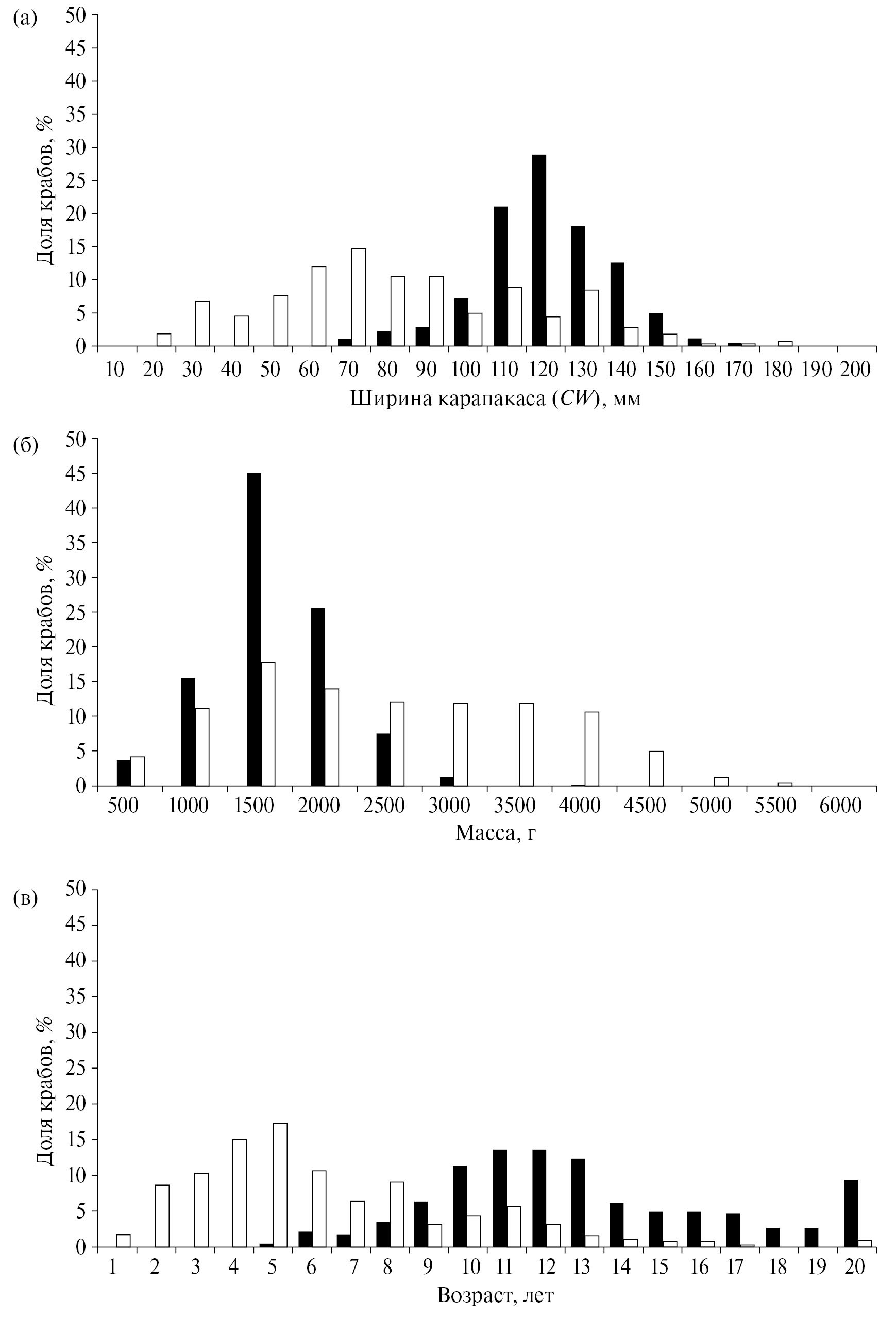 Рис. 2. Распределение особей синего краба, выловленных в период исследований в Японском море с 2011 по 2014 гг, по ширине карапакса (а), массе (б) и возрасту (в); отдельно представлены данные по самкам (▪) и самцам (▫).
