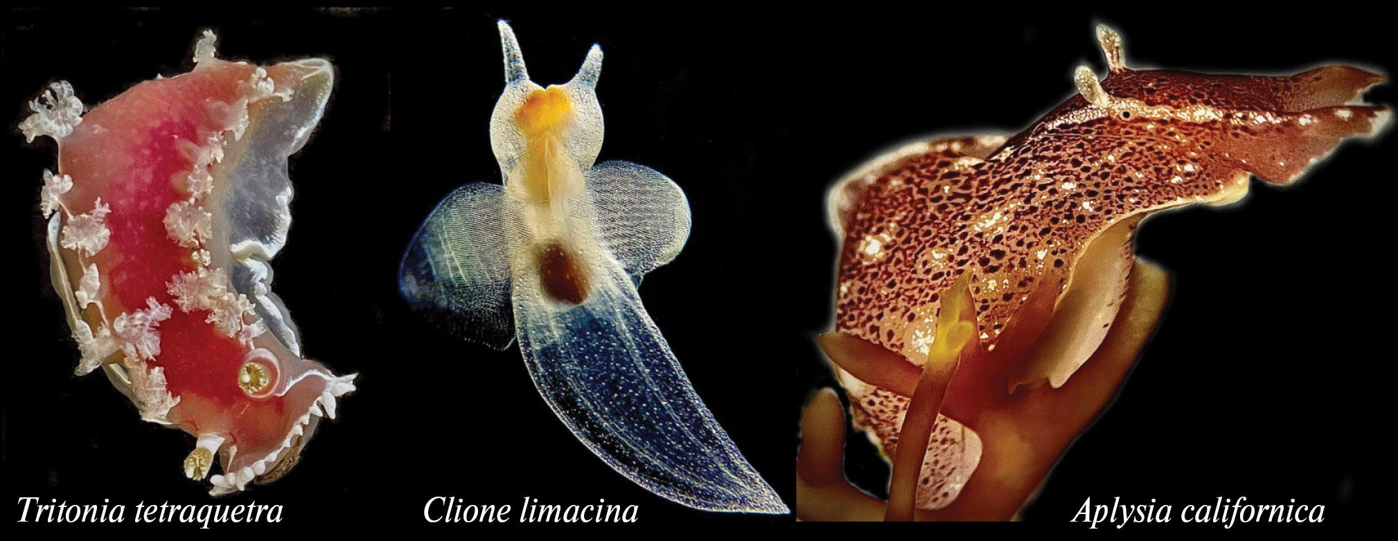 Рис. 1. Голожаберные моллюски — популярные нейробиологические модели. Tritonia tetraquetra (Pallas, 1788) [ранее известная как T. diomedea], Clione limacina (Phipps, 1774) из Friday Harbor США, Aplysia californica (J. G. Cooper, 1863) из Калифорнии, США. Фото: Леонид Мороз.
