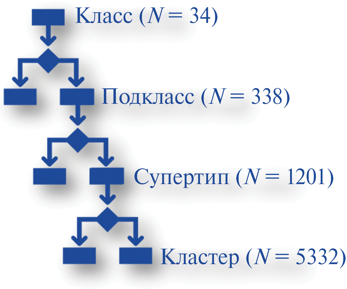 Рис. 3. Принцип иерархической классификации нейронов на основе сходства транскриптомов одиночных нейронов. Указано число групп на каждом иерархическом уровне (по данным статьи Yao et al., 2023).