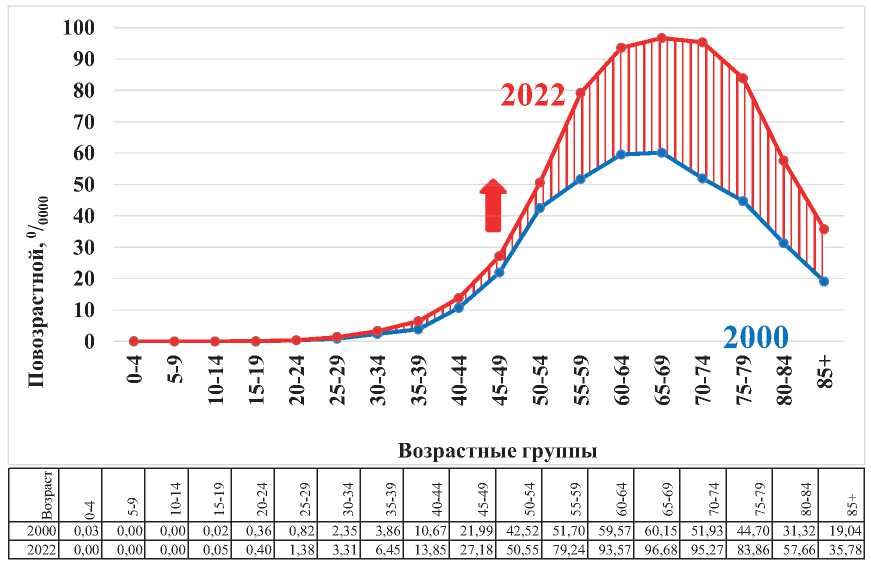 Fig. 5 with table. Age-specific incidence trends of MN CU (C54) in the female population of Russia by age group. 2000 and 2022 [9, 10, 11]