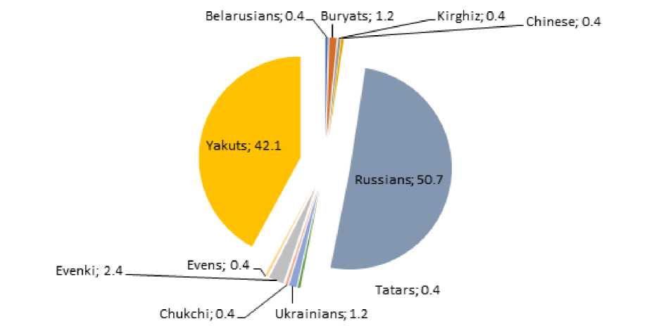 В исследование включены 254 женщины с диагнозом злокачественное новообразование (ЗНО) молочной железы, проходившие лечение в Якутском республиканском онкологическом диспансере в период с 2020 по 2023 гг. Критериями включения являлись подтвержденный диагноз злокачественного новообразования молочной железы и наличие информации об этническом происхождении пациентки (европеоидное (русские, украинцы, белорусы) или монголоидное (якуты, эвенки, буряты, эвены, киргизы, китайцы, татары) происхождение). Выборка пациенток была сформирована без учета семейной истории заболевания. Возраст манифестации заболевания варьировал от 22 до 85 лет. Средний возраст больных составлял 51,0 ± 11,1 года. В этнической структуре исследованных женщин основные группы составили русские (50,7 %) и якуты (42,1 %) (рис. 1). Пациенты других национальностей встречались единично (n = 18 (7,1 %)). Тестирование мутаций, ассоциированных с РМЖ, осуществлялось методом ПЦР (n = 254) и методом таргетного высокопроизводительного секвенирования (NGS, next-generation sequencing) (n = 138).