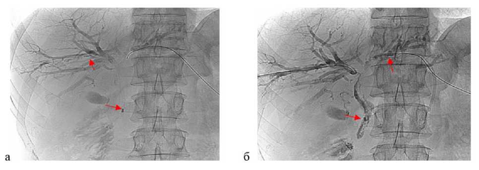 Рис. 2. Внутрипротоковая фотодинамическая терапия под рентгеноскопическим контролем. а — рентгенограмма: катетер с цилиндрическим диффузором заведен через правый долевой проток и расположен непосредственно на уровне опухоли, между дистальной и проксимальной рентгеноконтрастными метками (стрелки); б — рентгенограмма: катетер с цилиндрическим диффузором заведен через левый долевой проток и расположен непосредственно на уровне опухоли, между дистальной и проксимальной рентгеноконтрастными метками (стрелки)