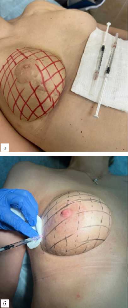 Данная методика проводилась следующим образом: пациентке наносили предварительную разметку (рис. 1, а). 200 ЕД инкоботулотоксина А разводили с физиологическим раствором (из расчета 50 ЕД на 1 мл физиологического раствора). С помощью инсулинового шприца объемом 1 мл с шагом 2−3 см выполняли диффузное введение инкоботулотоксина А (рис. 1, б). В местах менее выраженного утолщения капсулы имплантата — по 2 ЕД в одну точку, а местах максимального утолщения капсулы и в зону келлоидного рубца — по 5 ЕД в одну точку с шагом 1,5−2 см.
