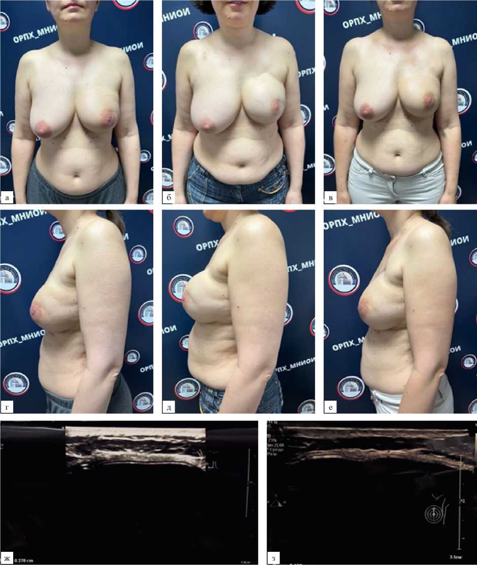 В клинических примерах представлены пациентки с разной степенью выраженности капсулярной контрактуры. В клиническом примере № 1 пациентка обратилась через 3 года после лучевой терапии с жалобами на уплотнение в реконструированной левой молочной железе. При осмотре и пальпации заметны и ощущаются контуры имплантата, также заметна деформации груди (рис. 2, а, б, д). Толщина капсулы до введения БТА по данным УЗИ максимально составила 2,78 мм (рис. 2, ж). Пациентке выполнено 2 курса инъекциями ботулотоксина типа А. Через 2 месяца отмечался положительный эффект в виде снижения выраженности болевого синдрома, уменьшения деформации реконструируемой левой молочной железы, при пальпации реконструированная молочная железа мягче (рис. 2, в, е). По данным УЗИ толщина капсулы составила максимально 1,58 мм (рис. 2, з).