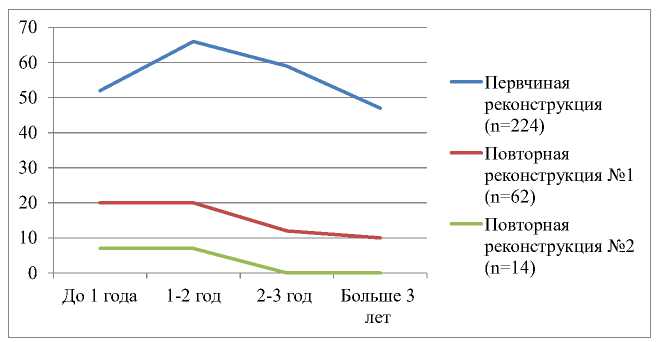 В нашем отделении были получены аналогичные результаты. Были проанализированы результаты у 224 пациенток с первичной реконструкцией. У большинства пациентов КК формировалась в 1–2-ой год после проведения комбинированного/комплексного лечения. Если КК возникала повторно, то интервал времени сокращался. То есть можно сделать вывод, — чем чаще происходила повторная реконструкция, тем временной интервал становился меньше для последующей замены (рис. 4).