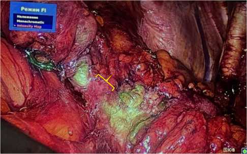 Рис. 2. ICG-ангиография правого УИА: желтым выделена область стриктуры