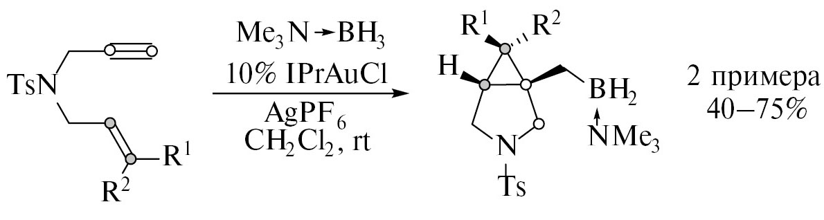 Перехват циклопропилкарбенового комплекса золота, полученного из 1,6-енинов, можно осуществить при взаимодействии с дополнительной двойной связью, присутствующей в субстрате. Примеры подобного превращения в синтезе 3-АБГ были представлены с использованием содержащих терпеноидный фрагмент N-пропаргилтозиламидов (схема 3) [22]. В качестве катализатора использовался комплекс золота с трифенилфосфин-содержащим каликс[6]ареном, который, впрочем, не оказывал какого-либо специфического для макроциклического каркаса воздействия на ход реакции.