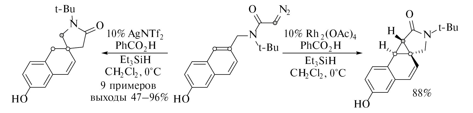 Пример аналогичной внутримолекулярной деароматизации показан на диазоацетамидном производном β-нафтола в условиях катализа комплексами родия (схема 33) [79]. В то время как родиевый и медный карбеноиды имеют преимущественно ковалентный характер и приводят в значительной степени к продуктам циклопропанирования, аналогичный комплекс с серебром более электрофильный и имеет повышенную тенденцию к ипсо-атаке ароматического кольца.