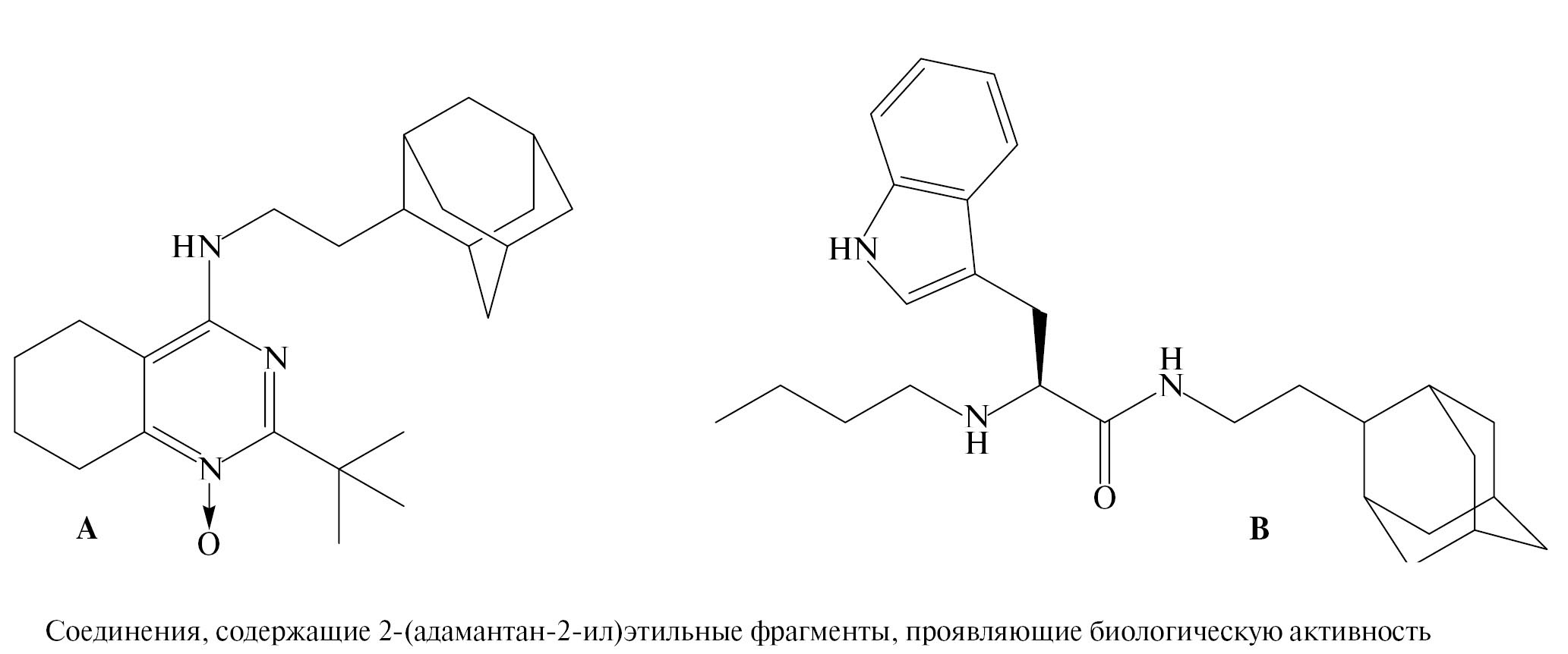 Из литературных данных известно, что 2-(адамантан-2-ил)этиламин использовали для синтеза адамантилариламинов [9] и адамантилгетериламинов [10], которые являются перспективными для синтеза новых противовирусных препаратов (рисунок). Например, 4-((2-(адамантан-2-ил)этил)амино)-2-(трет-бутил)-5,6,7,8-тетрагидрохиназолин-1-оксид (рисунок, А) обладает активностью в отношении вируса клещевого энцефалита (EC50 = 6.6 ± 0.4 мкмоль/л), при этом наличие адамантильного фрагмента является важным фактором для проявления данного вида активности [11]. (S)-N-(2-(Адамантан-2-ил)этил)-2-(бутиламино)-3-(1H-индол-3-ил)пропанамид (рисунок, B) обладает свойствами, позволяющими рассматривать это соединение в качестве потенциального лекарственного средства для симптоматической терапии болезни Альцгеймера (IC50 = 25.3 ± ± 0.9 нмоль/л), действуя по механизму ингибирования бутирилхолинэстеразы (BChE) [12]. При этом следует отметить, что биологическая активность соединений, содержащих липофильный, 2-(адамантан-2-ил)этиленовый фрагмент, изучена мало и представляет несомненный научный и практический интерес.