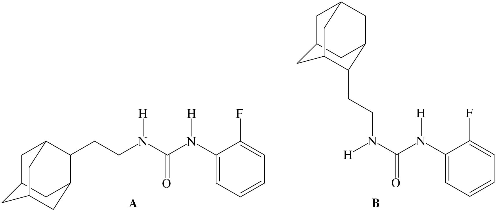 При разработке новых адамантилсодержащих ингибиторов растворимой эпоксидгидролазы (sEH), фермента арахидонового каскада [2–4], который превращает эпоксиды жирных кислоты (в первую очередь арахидоновой кислоты) в вицинальные диолы, нами проводится целенаправленная модификация липофильной части молекул ингибиторов. Ранее установлено, что введение метиленового или этиленового мостиков между адамантильным фрагментом и мочевинной (или тиомочевинной) группой существенно повышает ингибирующую активность соединений в отношении растворимой эпоксидгидролазы (до 2.5 раз) [5], а также положительно влияет на их водорастворимость [6]. Кроме того, было найдено, что во всех ранее полученных сериях адамантилсодержащих ингибиторов мочевины, в которых адамантильный фрагмент связан с мочевинной группой по мостиковому положению, превосходят аналоги, связанные по узловому положению [7]. Таким образом, актуальным является совмещение 2 указанных структурных фрагментов в новой серии мочевин.