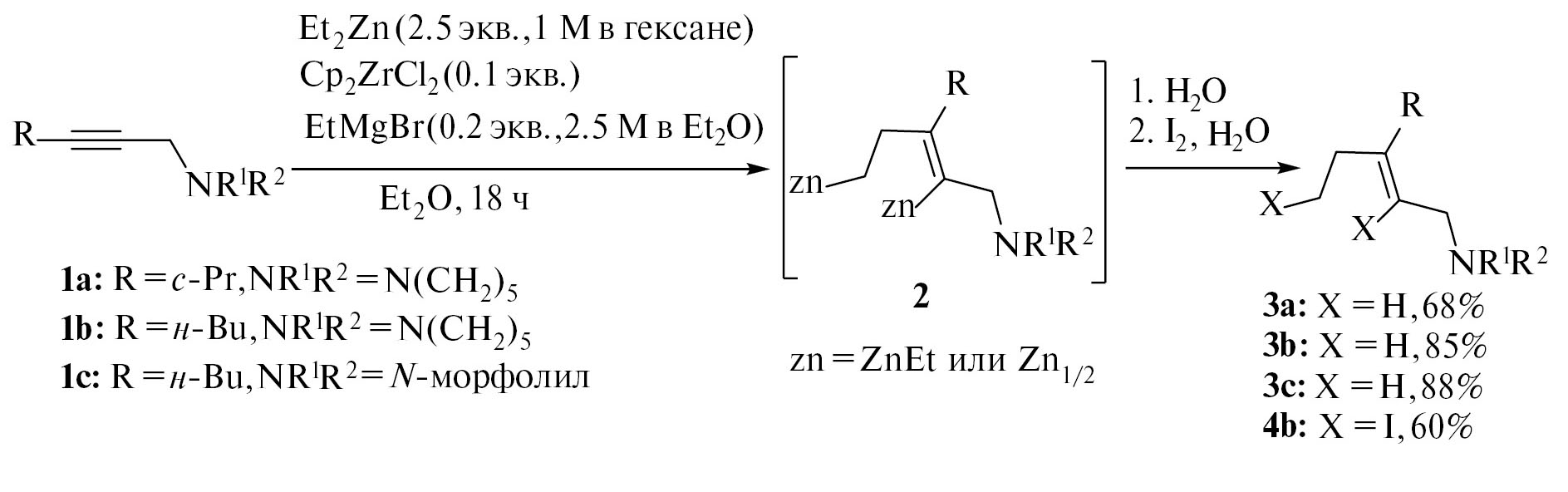 Мы обнаружили, что реакция 2-алкиниламинов 1 с 2,5 эквивалентами Et2Zn (1 M в гексане) в присутствии 10 мол. % Cp2ZrCl2 и 20 мол. % EtMgBr (2,5 M в диэтиловом эфире) в растворе диэтилового эфира при комнатной температуре за 18 ч после гидролиза и иодинолиза дает соответствующие замещенные аллиламины 3 и 4 с Z-конфигурацией двойной связи (схема 1). Реакция проходит регио- и стереоселективно. Структура образующихся замещенных 2-алкениламинов установлена с помощью 1D- и 2D-ЯМР спектроскопии продуктов их гидролиза 3a–c и иодинолиза 4b. Таким образом, присутствие электроноакцепторного атома кислорода морфолильного заместителя в структуре алкиниламина 1с, а также пиперидинового и циклопропильного заместителей в соответствующих ацетиленовых субстратах 1a и 1b не препятствует 2-цинкоэтилцинкированию тройной углерод-углеродной связи пропаргиламинов. Полученные данные иодинолиза реакционной смеси свидетельствуют о генерации металлоорганического интермедиата 2 с двумя активными металл-углеродными связями, что позволяет отнести изучаемое превращение к реакции 2-цинкоэтилцинкирования или циклоцинкирования. Природа переходного металла металлокомплексного катализатора сильно влияет на маршрут превращения пропаргиламинов в реакции с Et2Zn. Так, замена Cp2ZrCl2 на NbCl5 в изучаемой реакции приводит к образованию уже не продуктов 2-цинкоэтилцинкирования, а 1,2-дизамещенных (2Z)-алкениламинов, получающихся в результате восстановления замещенных пропаргиламинов [19]. В то же время, при использовании Ti(O-iPr)4 в качестве катализатора в реакции замещенных ацетиленов с Et2Zn образуются продукты 2-цинкоэтилцинкирования [16]. Мы полагаем, что прохождение реакции по пути 2-цинкоэтилцинкирования в случае использования Cp2ZrCl2 и Ti(O-iPr)4 обусловлено близкой природой атомов циркония и титана.