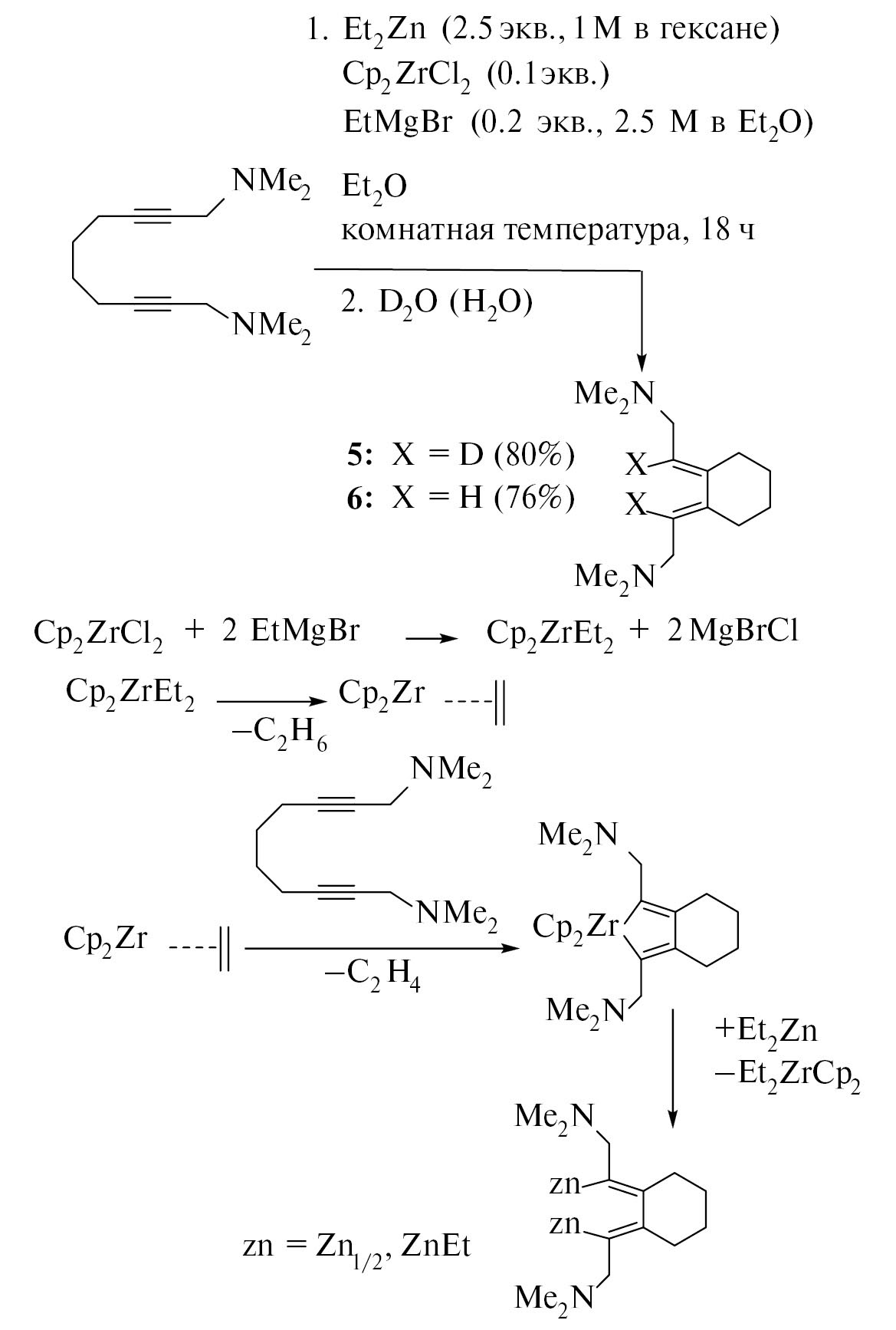 Известно, что Zr-катализируемое карбоалюминирование α,ω-бис(аминометил)алкадиинов и триметил(окт-7-ен-1-ин-1-ил)силана с помощью Et3Al проходит с селективным образованием алкилиденовых производных циклогексана [20, 21]. В настоящей работе мы установили, что аналогичным образом проходит взаимодействие N,N,N’,N’-тетраметилдека-2,8-диин-1,10-диамина с 2,5 эквивалентами Et2Zn в присутствии 10 мол. % Cp2ZrCl2 и 20 мол. % EtMgBr в растворе диэтилового эфира. В результате реакции при комнатной температуре за 18 ч после дейтеролиза или гидролиза образуется бис-алкилиденовое производное циклогексана 5 и 6 (cхема 2). Согласно приведенной ниже схеме, при взаимодействии Cp2ZrCl2 с EtMgBr происходит быстрый обмен лигандами с образованием Cp2ZrEt2, который дает цирконоцен-этиленовый комплекс. При внедрении одной из ацетиленовых связей тетраметилдека-2,8-диин-1,10-диамина по Zr-C связи данного комплекса происходит вытеснение этилена из координационной сферы атома циркония и сочетание двух ацетиленовых фрагментов с формированием цирконациклопентадиенового интермедиата, последующее переметаллирование которого в каталитическом цикле и последующий дейтеролиз (или гидролиз) приводят к образованию целевого бис-алкилиденового производного циклогексана 5 и 6. В спектре NOESY соединения 6 наблюдается взаимодействие метиленовой группы N,N-диметиламинометильного фрагмента с α-метиленовой группой циклогексанового кольца, что указывает на E-конфигурации двойных связей. В спектре COSY продукта гидролиза 6 кросс-пик между триплетным сигналом атома водорода при двойной связи и дублетом метиленовой группы при атоме азота свидетельствует о геминальном расположении атома водорода и N,N-диметиламинометильной группы при атоме углерода двойной связи.