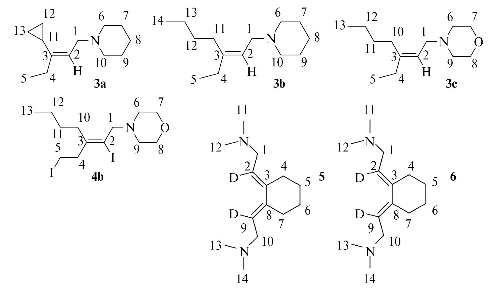 (Z)-1-(3-Этилгепт-2-ен-1-ил)пиперидин (3b). Спектр ЯМР 1Н, d, м.д.: δ = 0.92 (т, J = 6.4 Гц, 3Н, С(14)Н3), 1.01 (т, J = 7.3 Гц, 3Н, С(5)Н3), 1.20–1.40 (м, 4Н, С(12,13)Н2), 1.40–1.50 (м, 2Н, С(8)Н2), 1.50–1.70 (м, 4Н, С(7,9)Н2), 1.95–2.10 (м, 4Н, С(4,11)Н2), 2.20–2.50 (м, 4Н, С(6,10)Н2), 2.95 (д, J = 6.7 Гц, 2Н, С(1)Н2), 5.25 (т, J = 6.5 Гц, 1Н, С(2)Н1). Спектр ЯМР 13С, d, м.д. = 12.71 (C(5)), 14.04 (C(14)), 22.86 (C(13)), 24.47 (C(8)), 26.04 (2C(7,9)), 29.61 и 30.40 и 30.71 (C(4,11,12)), 54.64 (2C(6,10)), 56.69 (C(1)), 120.19 (C(2)), 144.14 (C(3)). Масс-спектр (ЭУ, 70 эВ), m/z (Iотн (%)) = 209 (9) [M+], 178 (8), 152 (1), 110 (4), 85 (72), 84 (100), 55 (17), 41 (19). Выход: 355 мг, 85%. Т. кип. 98 – 100°С (1 ммHg), бесцветная жидкость. C14H27N. Вычислено %: C, 80.31; H, 13.00; N, 6.69. Найдено %: C, 80.4; H, 12.8; N, 6.7.